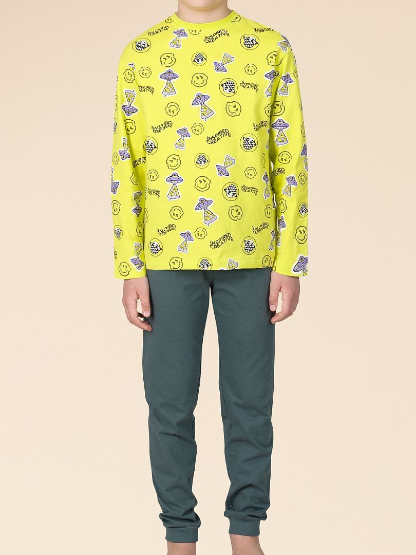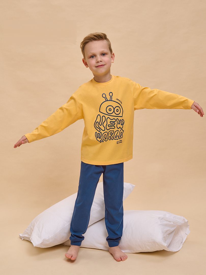 Состав: верх: 100%хлопок, низ: 100%хлопок Яркая и уютная пижама для мальчика. В составе ткани 100% хлопка — идеально для детской одежды! Изделие приятно на ощупь, отлично пропускает воздух, давая коже ребёнка дышать. Благодаря этому сон беззаботный и здоровый. В пижаме из хлопка ребёнку будет комфортно, даже если он сбросит одеяло во сне. Джемпер и брюки умеренного объёма, рукава свободные — комплект очень удобен для сна и игр. В поясе брюк мягкая и широкая резинка — не перекручивается и не давит. Манжеты брюк и отделка горловины джемпера из эластичной рибаны — ребёнку удобно надевать и снимать пижаму. А также резинка сохраняет отличную форму надолго даже после частых стирок. Брюки выполнены в практичном тёмно-зелёном цвете и лаконичном дизайне. Джемпер трендового желтого цвета декорирован забавным принтом, его оценит любой мальчик. Перевод: "Ошибка вдохновения". Комплект подходит для игр и сна как дома, так и в детском саду — отличный выбор для вашего ребёнка! Станет замечательным подарком, который способен вызвать искреннюю радость у вашего сына, в