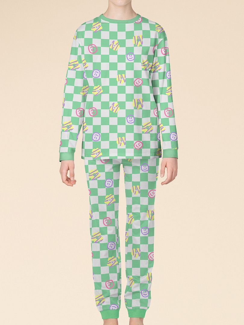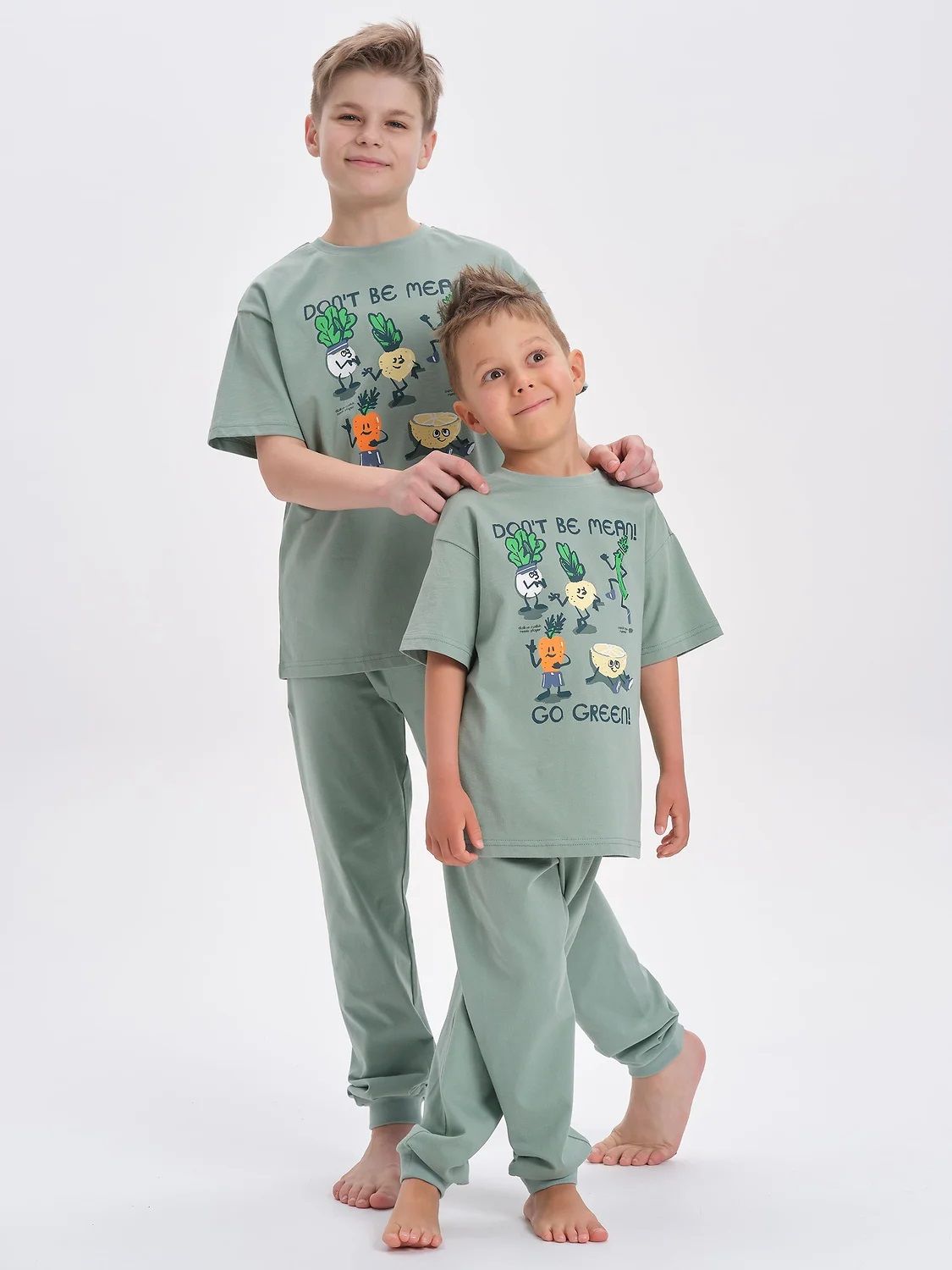 Состав: верх: 100%хлопок, низ: 100%хлопок Яркая и уютная пижама для девочки. Модель выполнена из 100% хлопка — идеальный вариант для детской пижамы. Ткань из хлопка мягкая, отлично пропускает воздух, давая коже ребёнка дышать. При этом в пижаме ребенку будет комфортно, даже если он сбросит одеяло во сне. Всё это обеспечивает комфортный и качественный сон. Джемпер и брюки умеренного объёма, плечо немного спущено, рукава широкие и свободные — в пижаме очень удобно спать. В поясе брюк мягкая и широкая резинка — не перекручивается и не давит. Манжеты и отделка горловины эластичные — они не растягиваются, пижаму удобно надевать и снимать. Комплект трендового цвета "зелёный инжир" выполнен в актуальной скейтерской стилистике. Он придётся по душе маленькой моднице. Пижаму украшает позитивный принт со смайликами. Комплект подходит для сна как дома, так и в детском саду — отличный выбор для вашего ребёнка! Станет замечательным подарком, который способен вызвать искреннюю радость у каждого ребёнка, оставив незабываемые воспоминания о любом празднике и принося