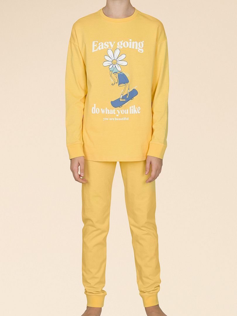 Состав: верх: 100%хлопок, низ: 100%хлопок Стильная и уютная пижама актуального жёлтого цвета для девочки. В составе ткани 100% хлопка — идеально для детской одежды! Модель приятна на ощупь, прекрасно пропускает воздух, позволяя коже ребёнка дышать. При этом в пижаме из хлопка ребёнку будет тепло, даже если он сбросит одеяло. Всё это обеспечивает комфортный и качественный сон. Джемпер и брюки среднего объёма, плечо немного спущено, рукава широкие и свободные — в пижаме очень удобно спать. Широкая и мягкая резинка в поясе не перекручивается и не давит. Манжеты и отделка горловины из эластичной рибаны — она не растягивается, ребёнку удобно надевать и снимать пижаму. Брюки однотонные, жёлтого цвета. Джемпер украшает позитивный принт в виде ромашки на скейтборде. Надписи переводятся: "лёгкая на подъём", "делай то, что тебе нравится", "ты прекрасна". В линейке представлены детские пижамы следующих размеров: 2 (92); 3 (98); 4 (104); 5 (110); 6 (116); 7 (122); 8 (128); 9 (134); 10 (140); 11 (146). Хлопковый комплект идеален для сна как дома, так и в детском саду — прекрасный выбор для вашего ребёнка! Пижама с брюками подходит для круглогодичного использования. Домашний комплект — замечательный подарок дочке, внучке, сестре на любой праздник. Выбирайте нужный размер по таблице размеров на фото. Цвет товара на экране вашего устройства может отличаться от цвета изделия вживую.