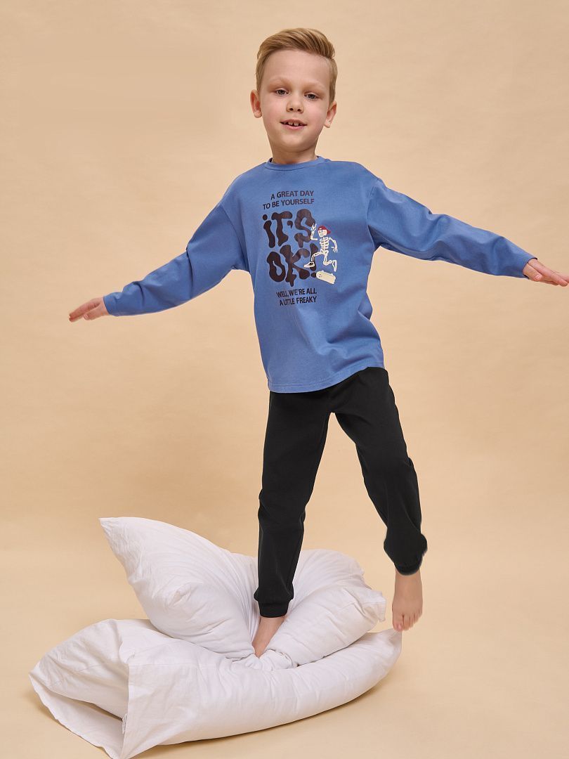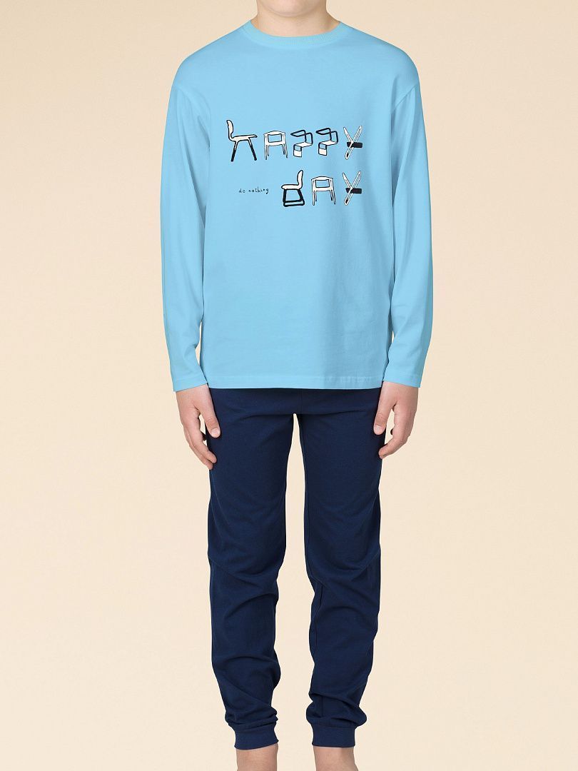 Состав: верх: 100%хлопок, низ: 100%хлопок Плюс 100 к уюту с нашей стильной пижамой для мальчика! Модель в стиле "хюгге" выполнена из 100% хлопка — оптимальный состав для детской пижамы. Изделие мягкое, отлично пропускает воздух, позволяя коже ребёнка дышать. При этом в пижаме из хлопка ребёнку будет комфортно, даже если он сбросит одеяло во сне. Джемпер и брюки среднего объёма, рукава свободные — в пижаме очень удобно спать. Широкая и мягкая резинка в поясе не перекручивается и не давит. Манжеты брюк и отделка горловины джемпера из эластичной рибаны — они не растягиваются, пижаму удобно надевать и снимать. Брюки выполнены в трендовом синем цвете и лаконичном дизайне. Джемпер голубого цвета декорирован уютным принтом с позитивным текстом. Перевод: "Счастлив. День безделья". Принт мягкий и эластичный, прекрасно переносит частые стирки. Такая пижама идеальна для игр, сна как дома, так и в детском саду — прекрасный подарок любому мальчику. Станет замечательным подарком, который способен вызвать искреннюю радость у вашего сына, внука, племянника, оставив