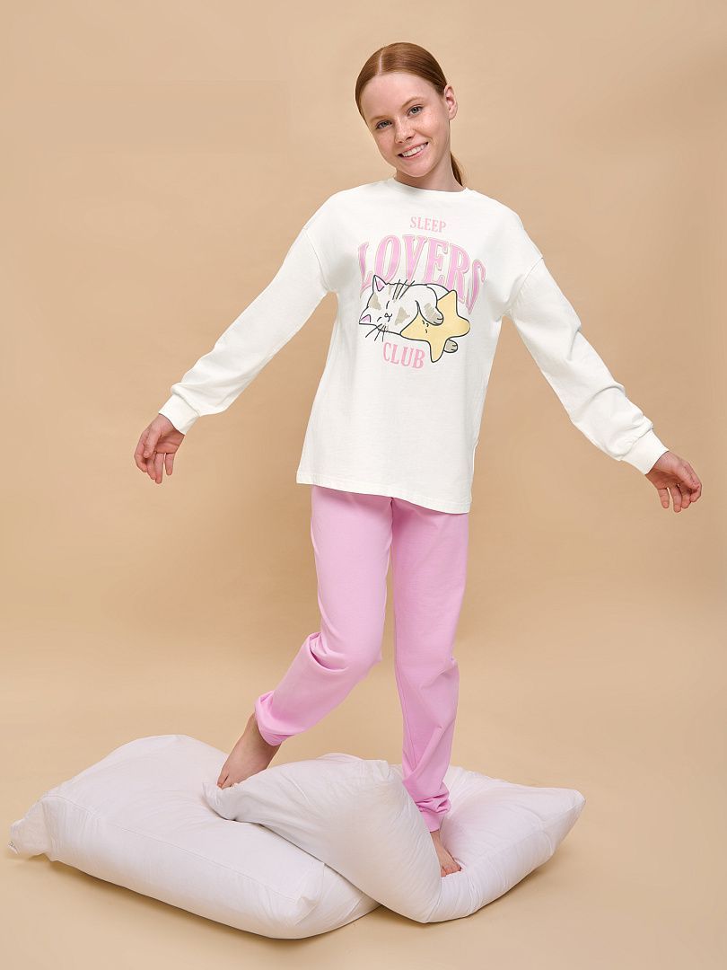 Состав: верх: 100%хлопок, низ: 100%хлопок Детская пижама для девочки. Модель выполнена из 100% хлопка — идеальный вариант для детской пижамы. Комплект для сна мягкий, гипоаллергенный и хорошо пропускает воздух. В хлопковой пижаме ребёнку будет тепло, даже если он раскроется во время сна. Всё это способствует комфортному и качественному сну. Джемпер и брюки умеренного объёма, плечо немного спущено, рукава широкие и свободные — в пижаме очень удобно спать. В поясе брюк мягкая и широкая резинка — не перекручивается и не давит. Манжеты и отделка горловины из эластичной рибаны — они не растягиваются, пижаму удобно надевать и снимать. Хлопковая пижама украшена милым принтом в виде спящего котика, надпись переводится: «клуб любителей поспать» — понравится любой девочке. Детская пижама неприхотлива в уходе. Принт эластичный и мягкий, легко переносит частые стирки. Детская пижама с брюками подходит для сна как дома, так и в детском саду — отличный выбор для вашего ребёнка! Помните о правильном уходе за изделием: рекомендуется стирать при температуре не выше 30 °C, без предварительного замачивания, с изнанки. Это поможет сохранить качество и цвет пижамы на длительное время.Не забывайте о выборе правильного размера. Используйте таблицу размеров на фотографии, чтобы выбрать подходящий вариант для вашей девочки.Обратите внимание, что цвет товара на экране вашего устройства может отличаться от реального.
