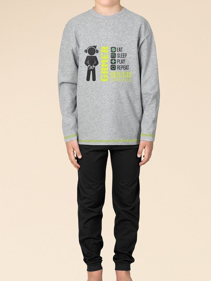 Состав: верх: 100%хлопок, низ: 100%хлопок Уютная пижама для мальчика. Изделие выполнено из 100% хлопка — идеальный вариант для детской пижамы. Ткань из хлопка приятна на ощупь и превосходно пропускает воздух, позволяя коже ребёнка дышать. В пижаме из хлопка ребёнку будет комфортно, даже если он сбросит одеяло. Джемпер и брюки умеренного объёма, рукава свободные — пижама очень удобна для сна. В поясе брюк мягкая и широкая резинка — не перекручивается и не давит. Манжеты брюк и отделка горловины джемпера из эластичной рибаны — комплект удобно надевать и снимать. А также резинка отлично сохраняет форму в течение долгого времени. Брюки выполнены в практичном чёрном цвете и лаконичном дизайне. Джемпер актуального оттенка "серый меланж" украшен контрастными строчками по низу и рукавам — один из модных трендов. По переду забавный принт геймерской тематики — порадует любого мальчишку! Перевод: "Есть, спать, играть, повторять. Счастье". Принт мягкий и эластичный, отлично переносит многочисленные стирки. Комплект подходит для сна как дома, так и в детском саду