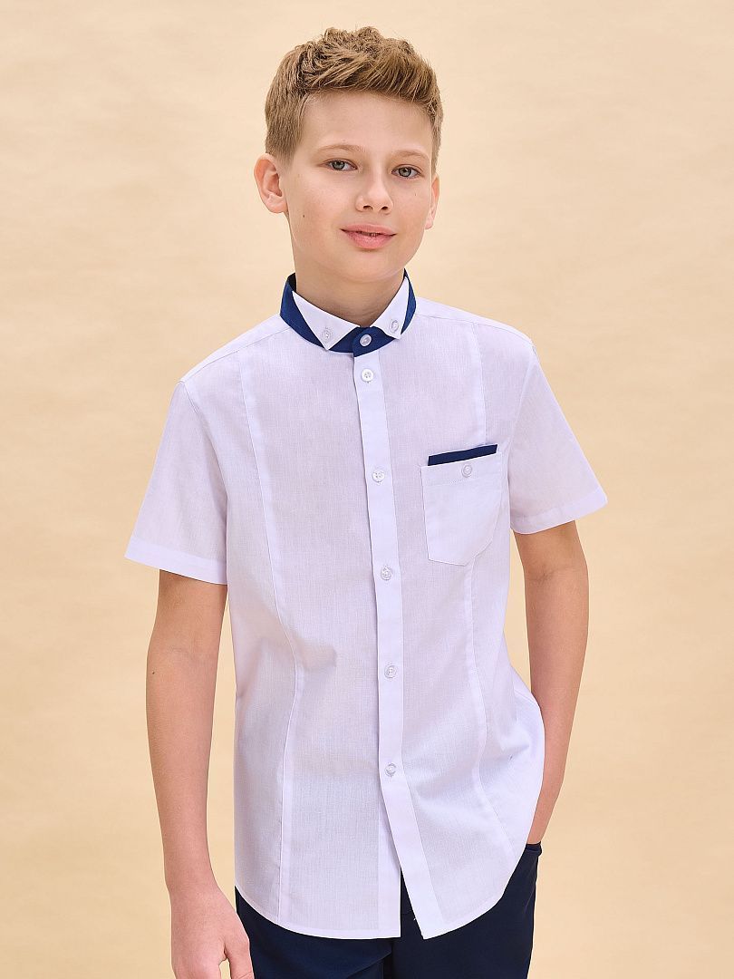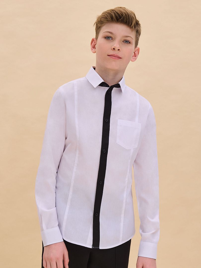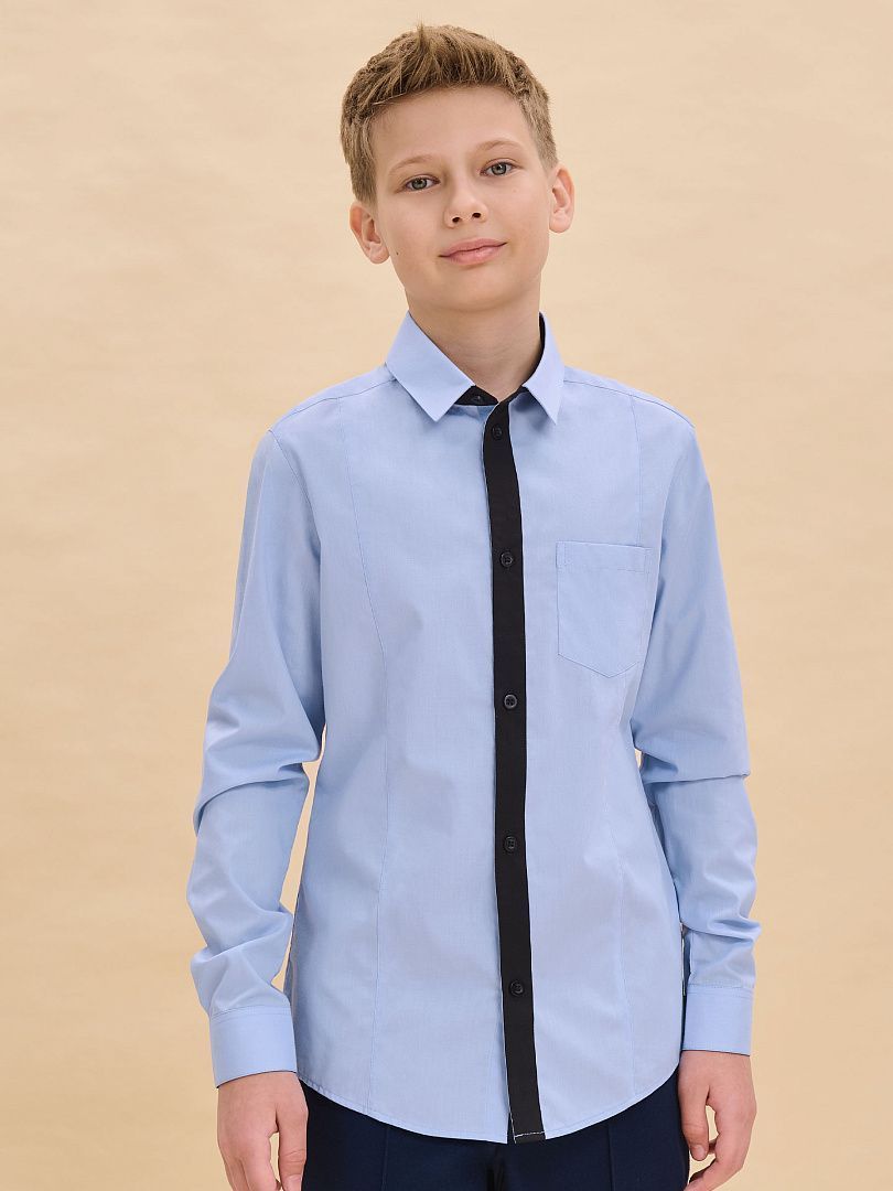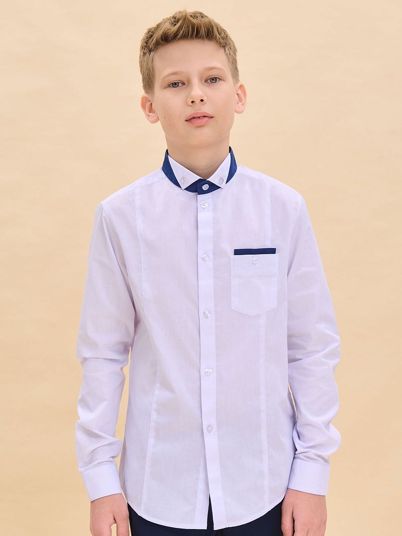 Состав: 60%хлопок 40%полиэстер Рубашка для мальчиков прилегающего силуэта. Двойной воротник из контрастной и основной ткани изделия проявление модного тренда на многослойность и возможность выделиться в школе.Ткань хорошо держит форму, пропускает воздух и легко разглаживается. А внутренняя контрастная отделка воротника избавит вас от частых стирок.