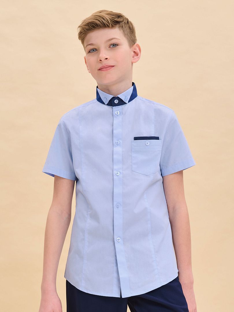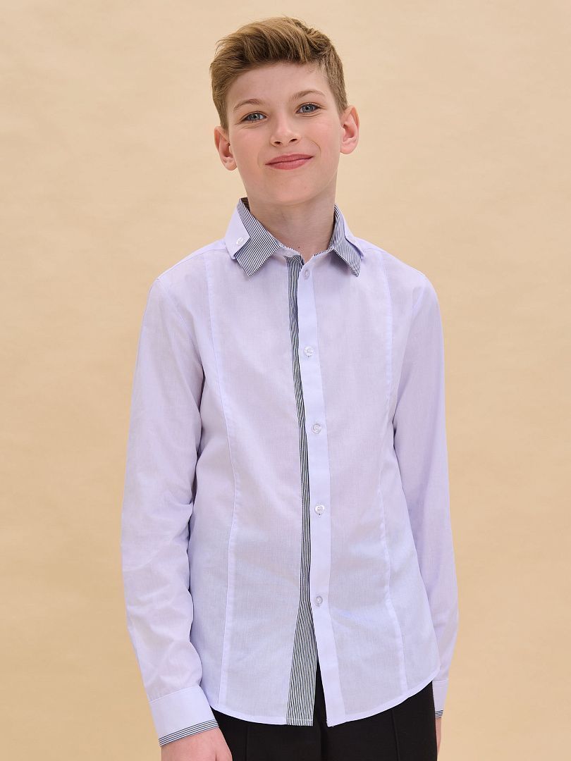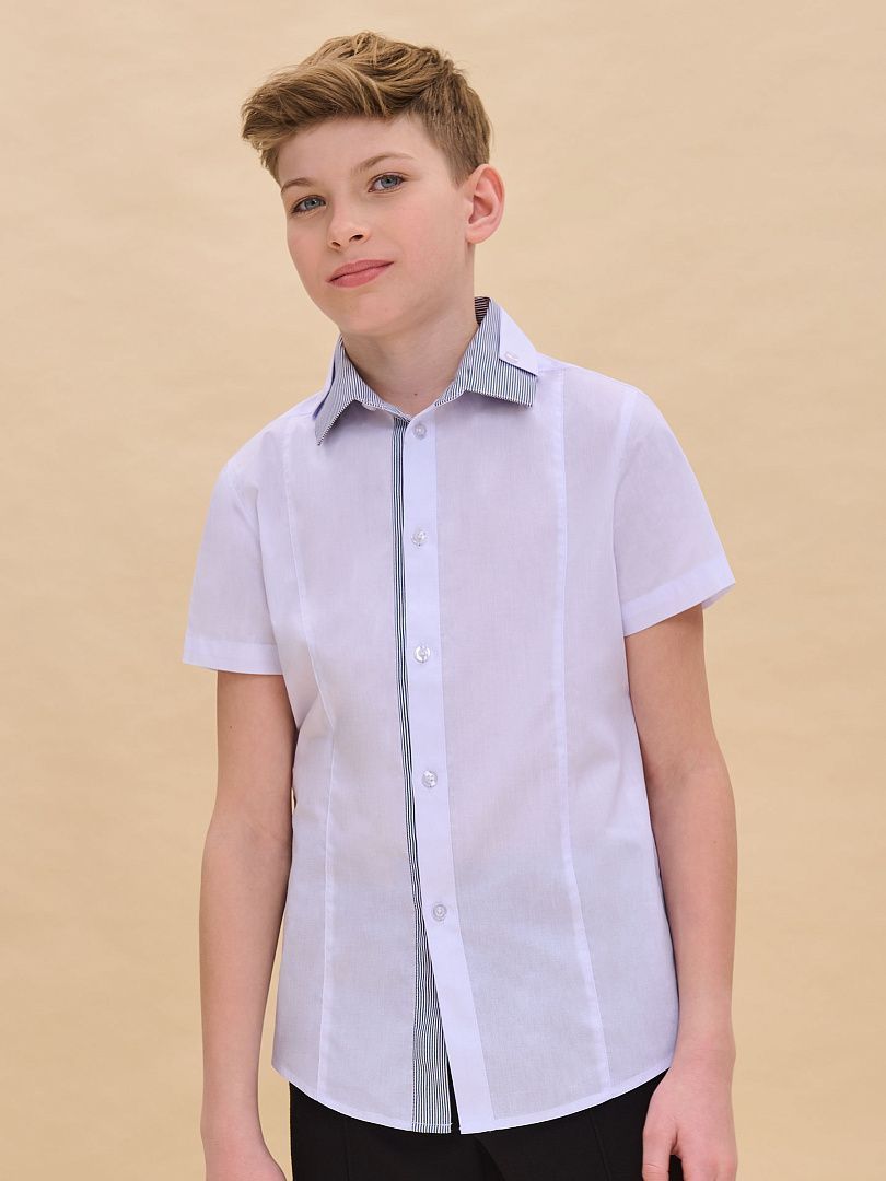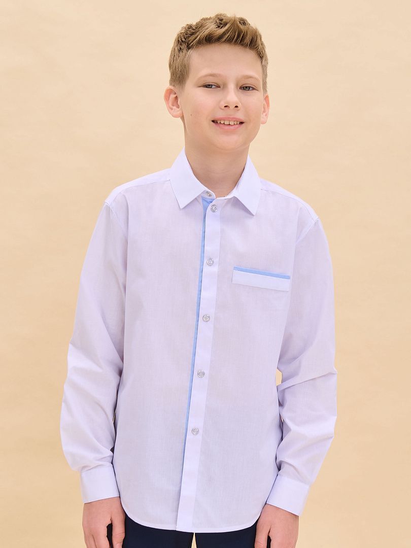 Состав: 60%хлопок 40%полиэстер Рубашка для мальчиков прилегающего силуэта. Двойной воротник из контрастной и основной ткани изделия проявление модного тренда на многослойность и возможность выделиться в школе.Ткань хорошо держит форму, пропускает воздух и легко разглаживается. А внутренняя контрастная отделка воротника избавит вас от частых стирок.