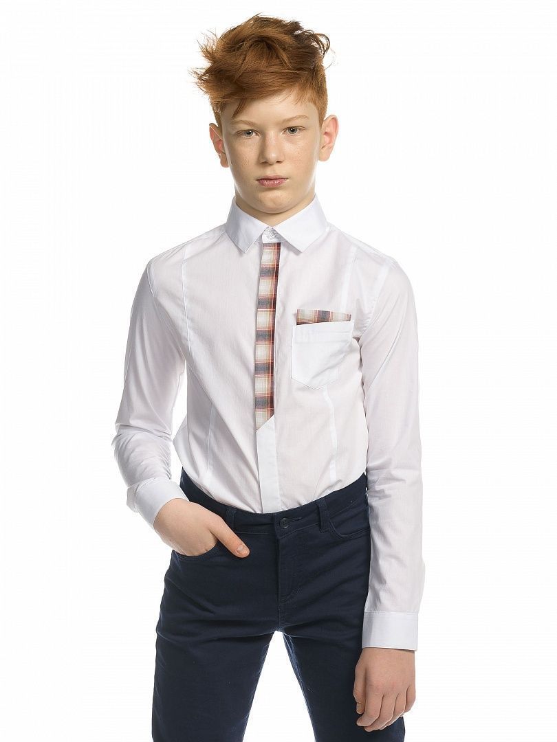 Состав: 60%хлопок 40%полиэстер Школьная рубашка с длинным рукавом для мальчика прилегающего силуэта. Натуральный хлопок в составе позволяет телу дышать, ткань приятна на ощупь и проста в уходе – быстро сохнет и легко гладится. Воротник не давит в застегнутом виде. Изюминка модели – имитация клетчатого галстука и платка в кармане. Идеальна для создания делового стиля. Отлично смотрится в паре с жилетом или пиджаком – классический вариант школьной одежды.