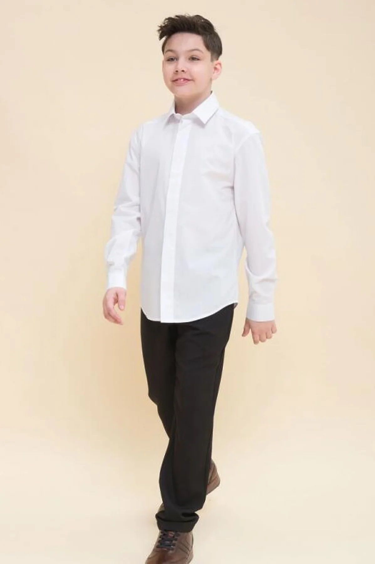Состав: 60%хлопок 40%полиэстер Школьная рубашка полуприлегающего силуэта для мальчиков. Преобладающий в составе ткани хлопок делает эту модель мягкой, дышащей и комфортной для ребёнка. Полиэстер помогает изделию сохранять форму и превосходный внешний вид. Рубашка с воротником типа windsor и вертикальные рельефы — классика, не выходящая из моды. Подойдет для стройных, элегантных мальчишек. Отличный вариант для школьной формы и любого торжественного случая. Идеально белый цвет без желтого и серого оттенка.