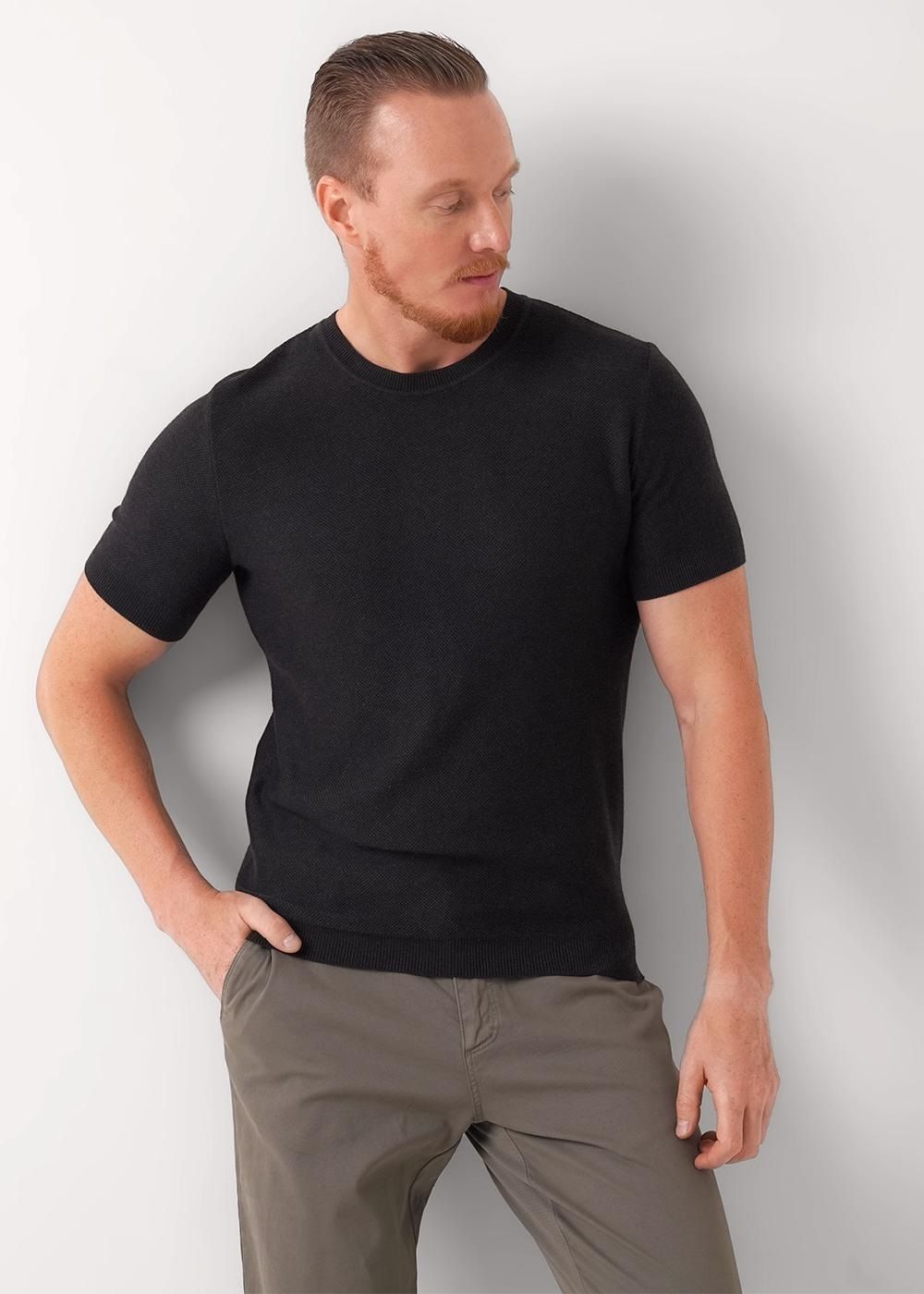 Состав: 46%Хлопок,46%ПЭ,8%Эластан. Базовая однотонная футболка стандартного объема с круглой горловиной, втачным рукавом из хлопкового меланжевого полотна с добавлением эластана. Является неотъемлемой частью мужского гардероба.
