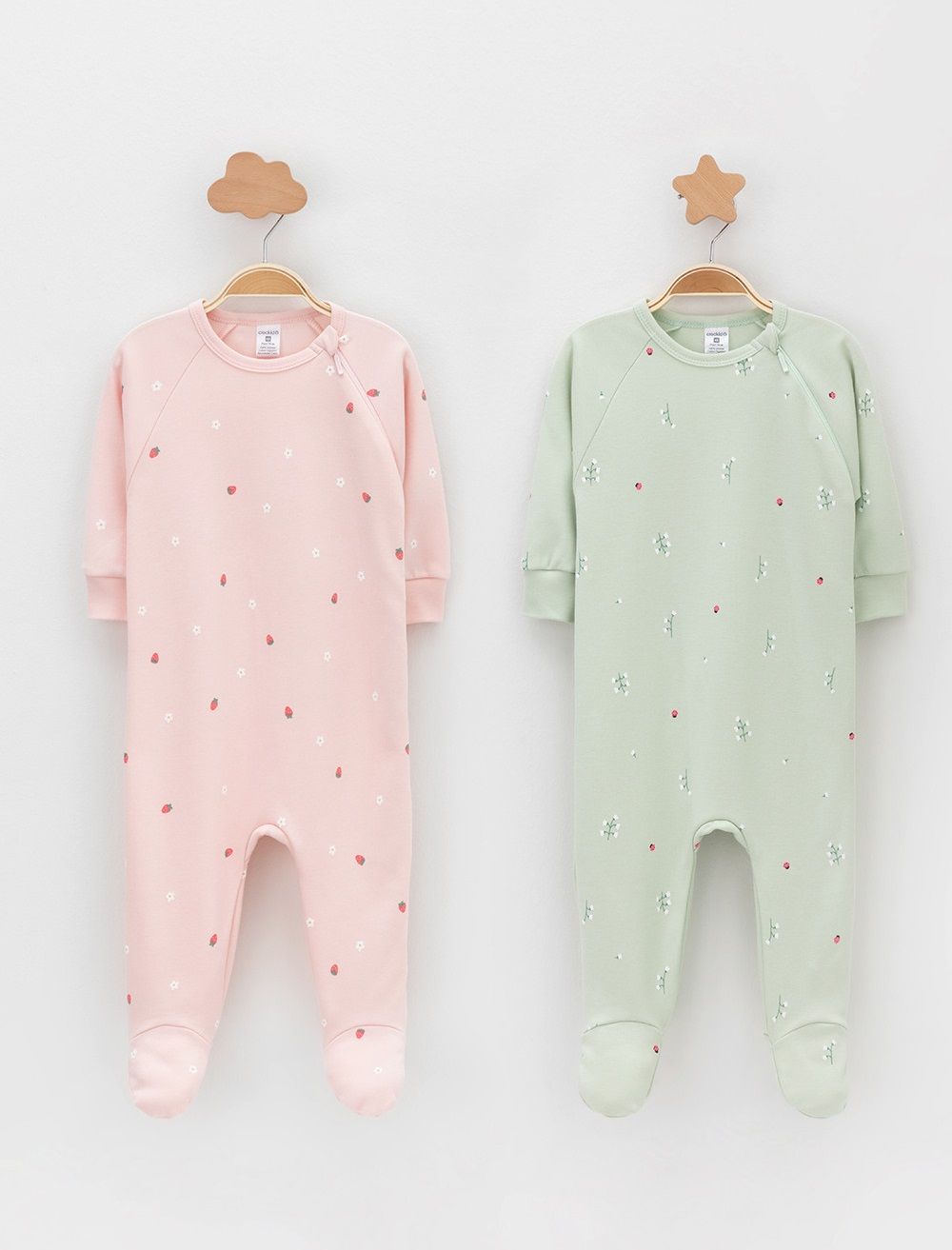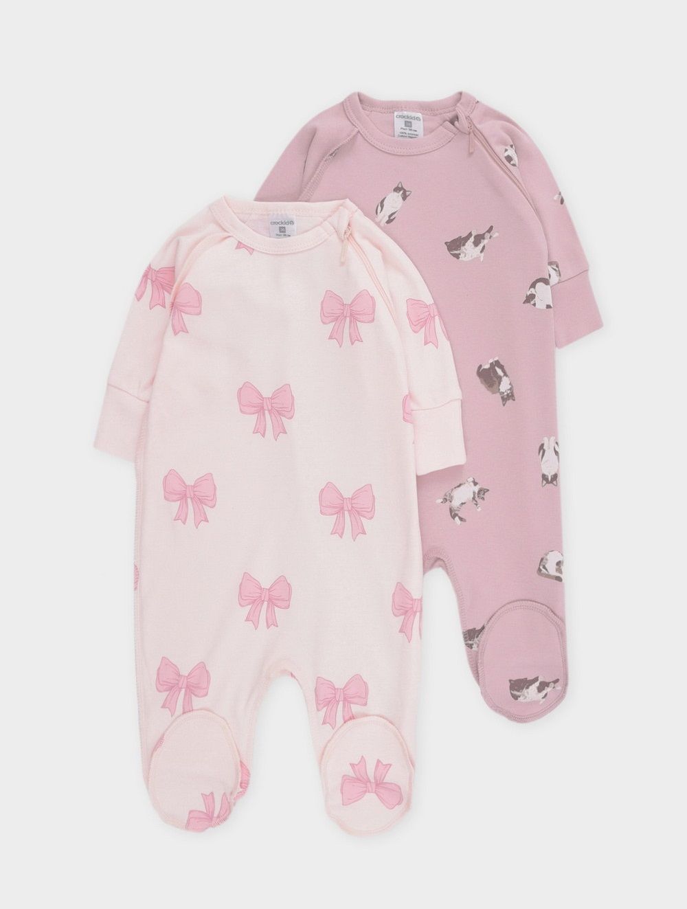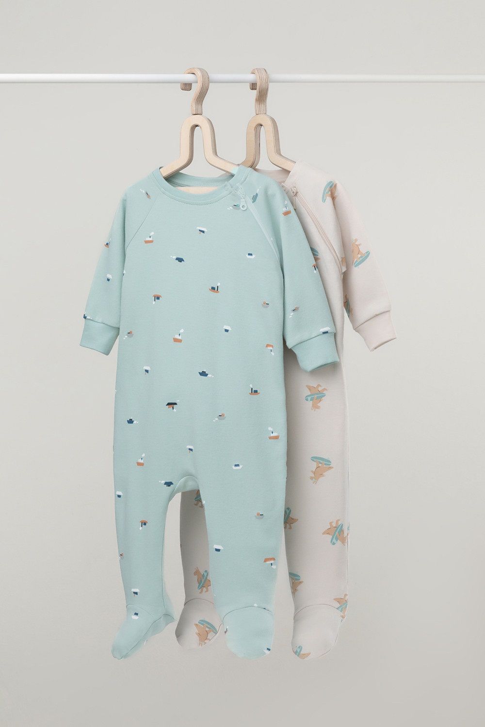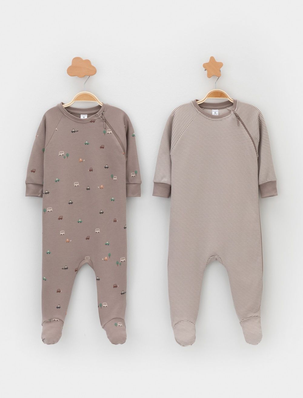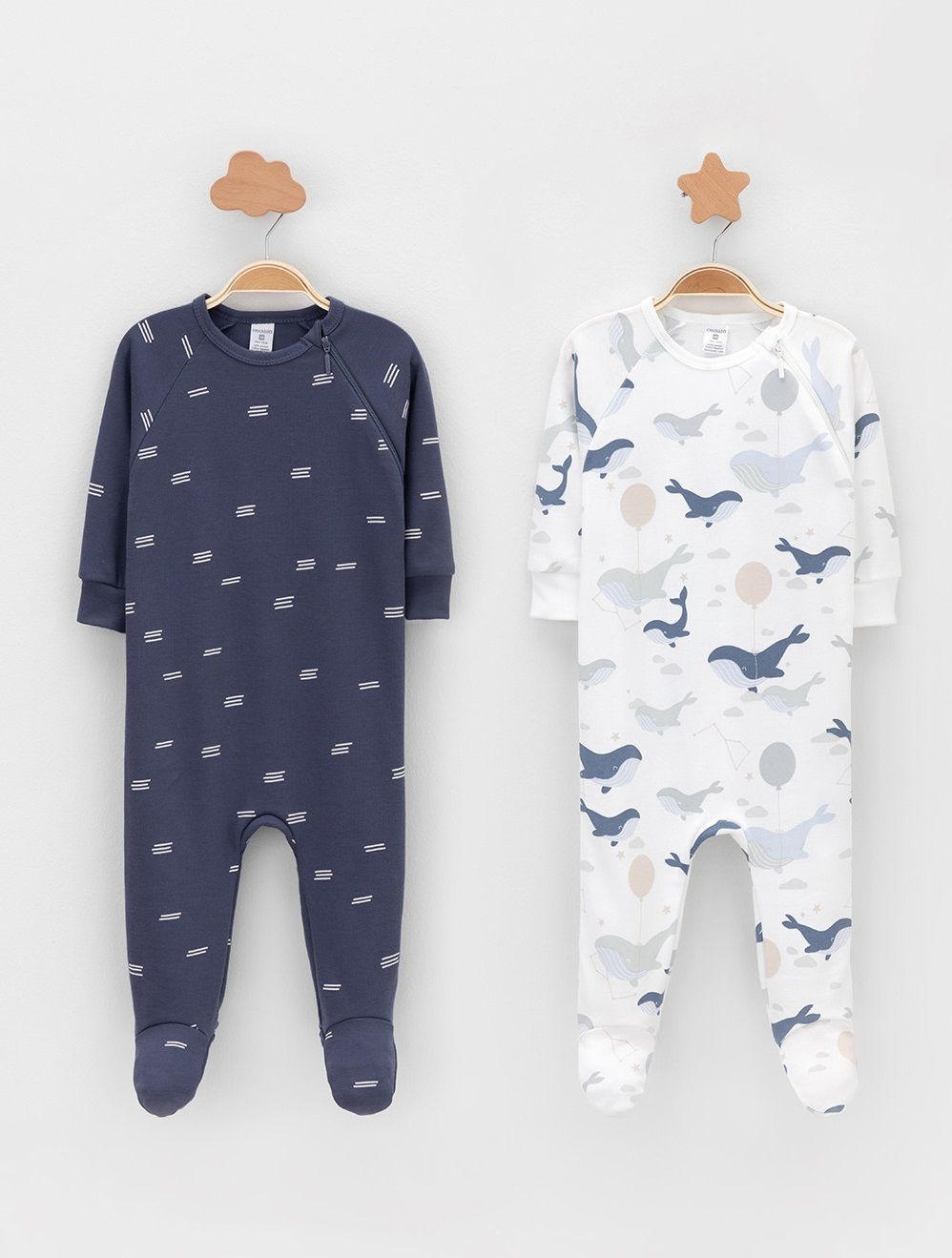 Состав: 100% хлопок. Комбинезоны для новорождённых из мягкого эластичного трикотажа интерлок, произведённого из натурального хлопка. В упаковке 2 штуки. Застёгиваются сбоку на молнию с мягкой защитой шеи и подбородка. Длинные рукава-реглан оканчиваются манжетами. Оригинальная набивка выполнена из стойких гипоаллергенных текстильных красителей. Все трикотажные полотна производятся в соответствии с нормами швейцарского сертификата ЭкоТекс.