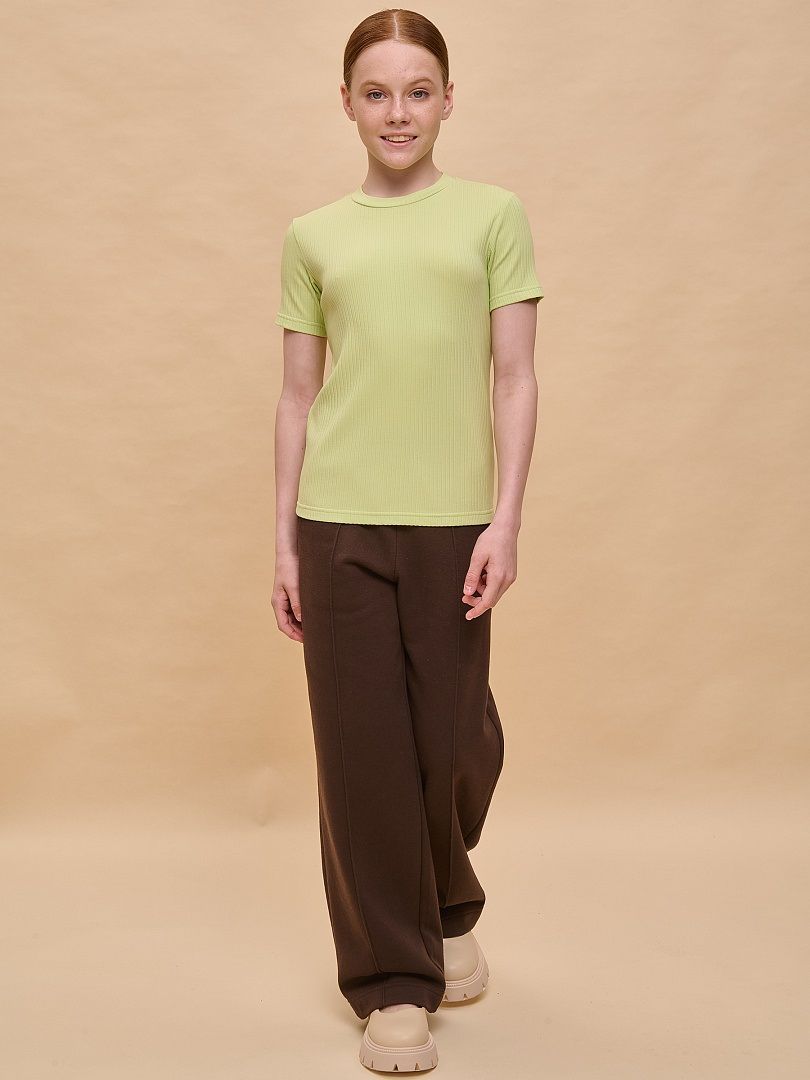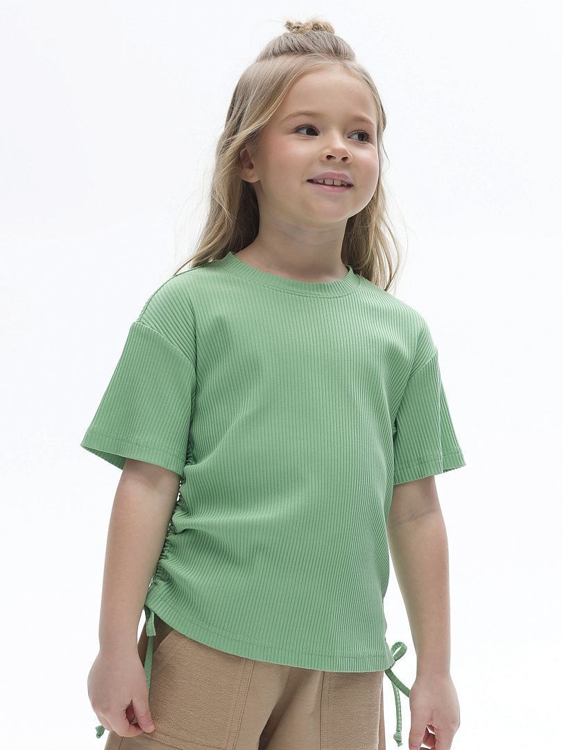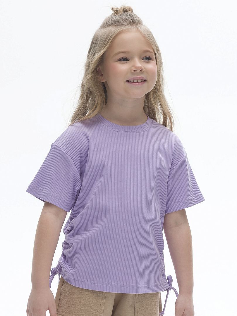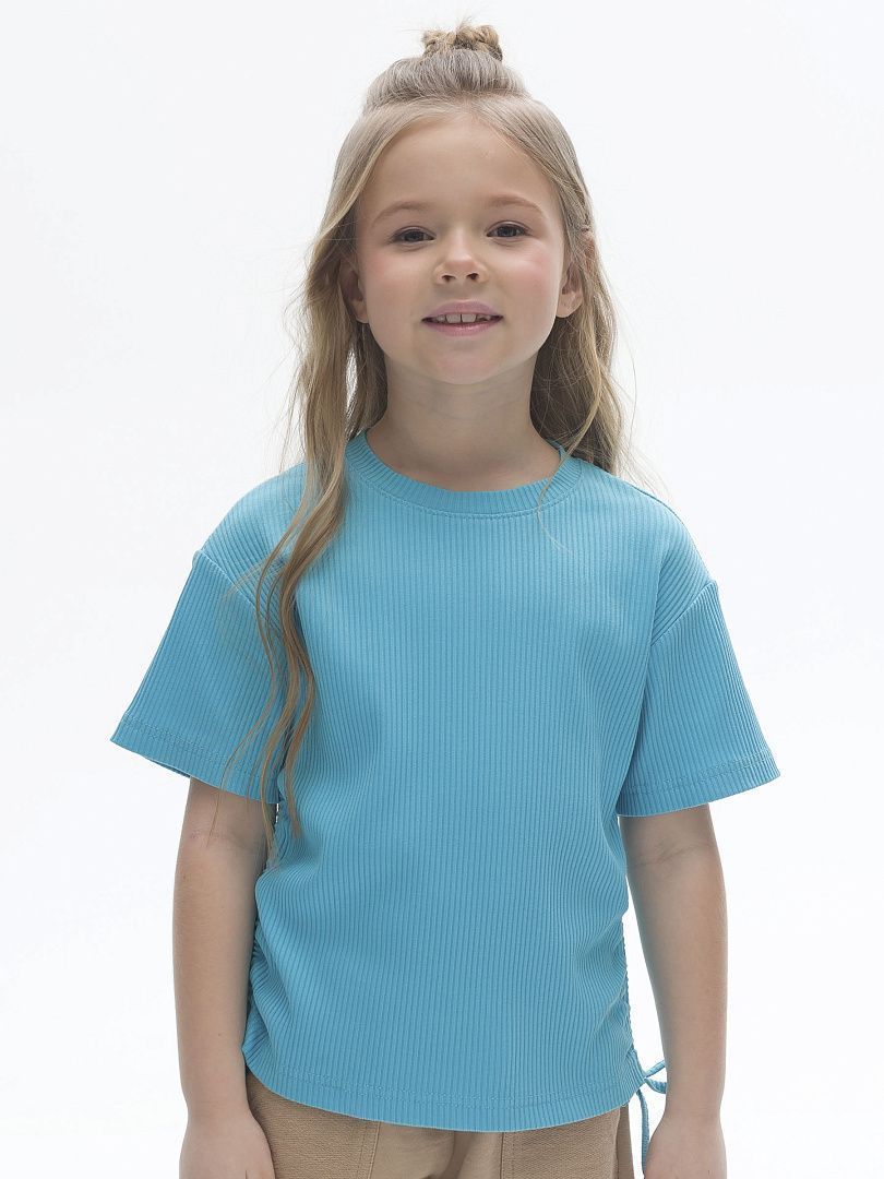 Состав: 58%хлопок 37%вискоза 5%эластан Футболка из модной ткани в рубчик для девочки. Благодаря преобладающим в составе хлопку и вискозе ткань изделия дышит и приятна на ощупь. Эластан помогает сохранять форму. По бокам модели кулиски с тесьмой — актуальный тренд. С их помощью можно делать стильную сборку с одной или двух сторон. Такая футболка хорошо сочетается с различными шортами, леггинсами, кюлотами или джоггерами.