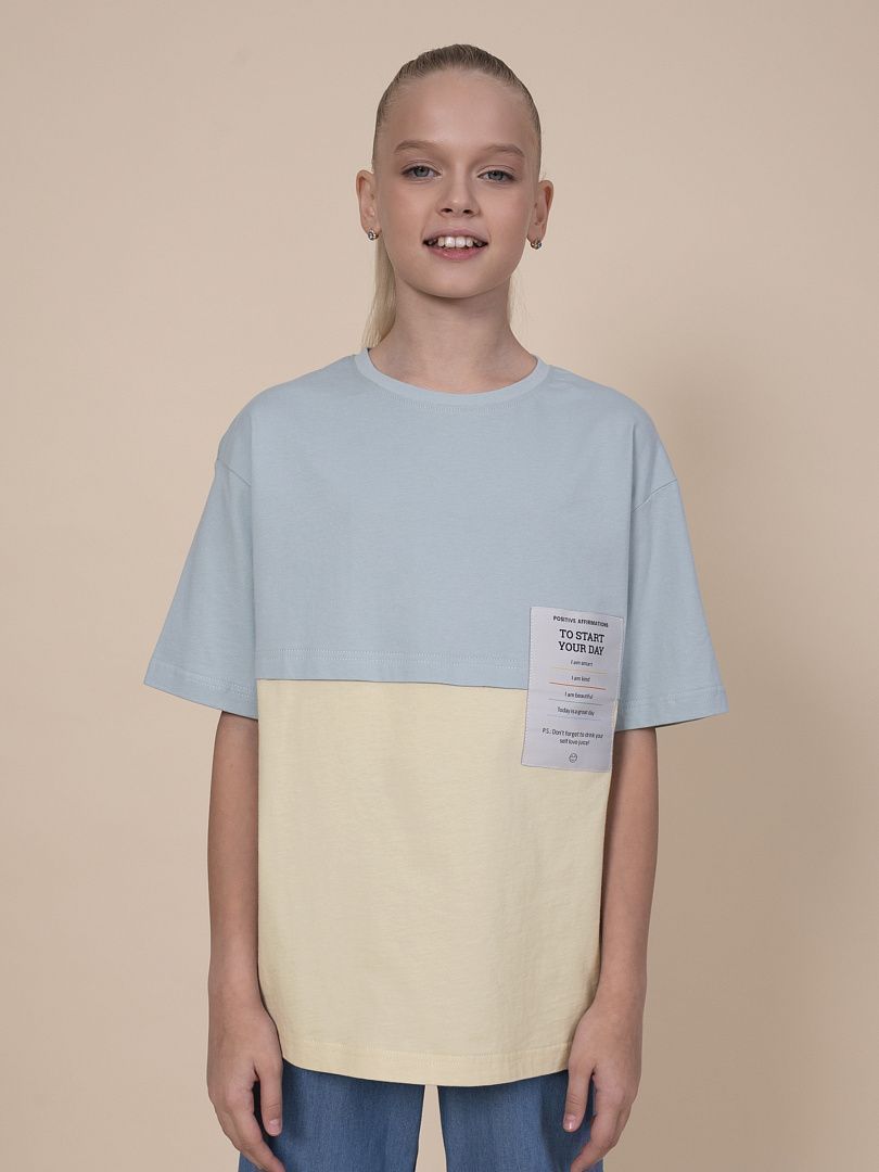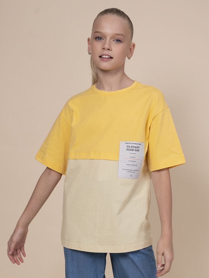 Состав: 100%хлопок Футболка оверсайз для девочки. 100% хлопок в составе – ткань мягкая, дышащая, приятная на ощупь. Жаккардовая нашивка с вытканным текстом – яркий визуальный акцент и изюминка модели, сохраняет декоративность при частых стирках. Имитация двухслойности – тренд сезона. Верх модели имитирует кроп-топ. Футболка отлично подходит для создания стильного образа весной и летом в паре с джоггерами или шортами. Идеальна для активного детства – на каждый день, для учебы и занятия спортом.Модель представлена в базовых универсальных цветах – желтый, ментол и персиковый.Выбирайте нужный размер по таблице размеров на фото. Цвет товара на экране вашего устройства может отличаться от цвета изделия вживую.