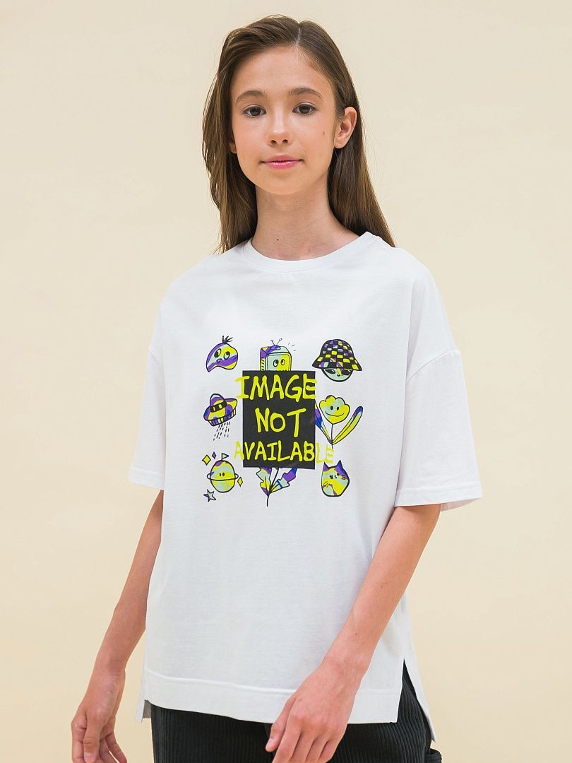 Состав: 100%хлопок Детская футболка для девочки. Комфортная майка свободного объёма не будет стеснять движений ребёнка. Джемпер оверсайз со спущенным плечом — один из модных трендов сезона. Небольшой вырез горловины обработан эластичной рибаной (ткань в рубчик) — она прекрасно держит форму, при этом ребёнку удобно надевать и снимать футболку. Спинка немного длиннее переда, боковые швы смещены вперёд, по бокам небольшие разрезы — актуальные, стильные детали. Изделие неприхотливо в уходе. Футболка с прикольным принтом в актуальном стиле граффити по переду и спинке. Принты изображают забавные детские рисунки, надпись переводится: «изображение недоступно». Принты эластичные и прочные, не боятся частых стирок. В составе ткани 100% хлопка — майка мягкая, дышащая, приятная на ощупь. Оверсайз-футболка для девочки выполнена в белом цвете. Размерный ряд: 1 (86); 2 (92); 3 (98); 4 (104); 5 (110); 6 (116); 7 (122); 8 (128); 9 (134); 10 (140); 11 (146). Белая футболка оверсайз с принтом подходит как для маленьких девочек, так и для девочек-подростков. Её можно носить летом, осенью и весной (демисезон), зимой в качестве среднего слоя одежды. Подходит для детского сада, спорта, прогулок, отдыха, а также в качестве домашней одежды. Легко сочетается с различными брюками, легинсами, юбками и шортами. Футболка с надписями — отличный подарок дочери, внучке или сестре на любой праздник или просто в качестве знака внимания и заботы.
