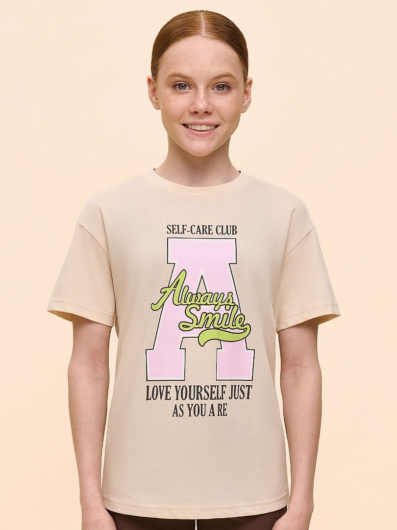 Состав: 100%хлопок Детская футболка для девочки небольшого объёма прямого кроя. Вырез горловины обработан эластичной рибаной (ткань в рубчик) — она прекрасно держит форму, не растягивается, при этом ребёнку удобно надевать и снимать футболку. Изделие неприхотливо в уходе. Футболка детская с принтом в трендовом университетском стиле по переду. Надписи переводятся: «клуб любви к себе», «люби себя таким, какой ты есть», «улыбайся всегда». Принт эластичный и прочный, без проблем переносит частые стирки. В составе ткани 100% хлопка — майка мягкая, воздухопроницаемая, приятная на ощупь. Футболка для девочек выполнена в универсальном цвете, который хорошо сочетается с различными брюками, шортами. Детские футболки с принтом подходят как для маленьких девочек, так и для девочек-подростков. Хлопковая футболка идеальна для любого времени года, её можно носить как летом, так и в холодное время года в качестве среднего слоя одежды. Помните о правильном уходе за изделием: рекомендуется стирать при температуре не выше 30 °C, без предварительного замачивания, с изнанки. Это поможет сохранить качество и цвет футболки на длительное время.Не забывайте о выборе правильного размера. Используйте таблицу размеров на фотографии, чтобы выбрать подходящий вариант для вашей девочки.Обратите внимание, что цвет товара на экране вашего устройства может отличаться от реального.