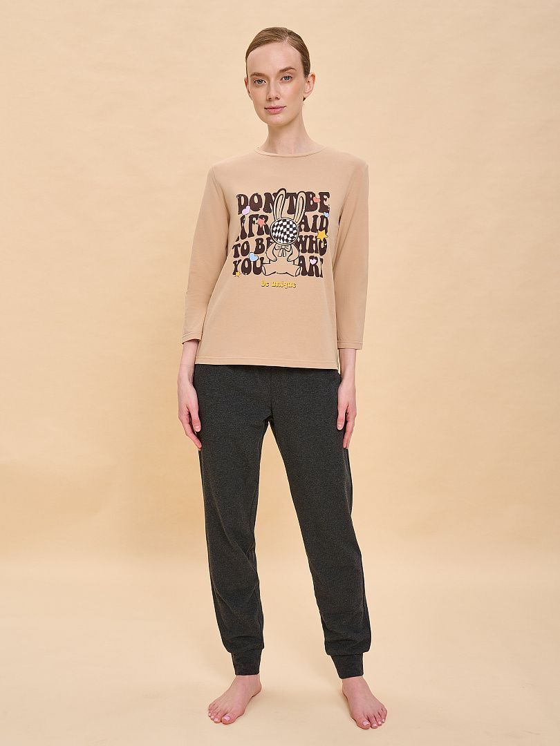 Состав: верх: 95%хлопок 5%эластан, низ: 95%хлопок 5%эластан Комплект женский футболка и брюки. Футболка прямого кроя среднего объема с эластичным rubber принтом. Перевод Счастливая пчелка ничего не поделаешь. Брюки умеренного объема на комфортной внутренней резинке с широкими манжетами из основной ткани.