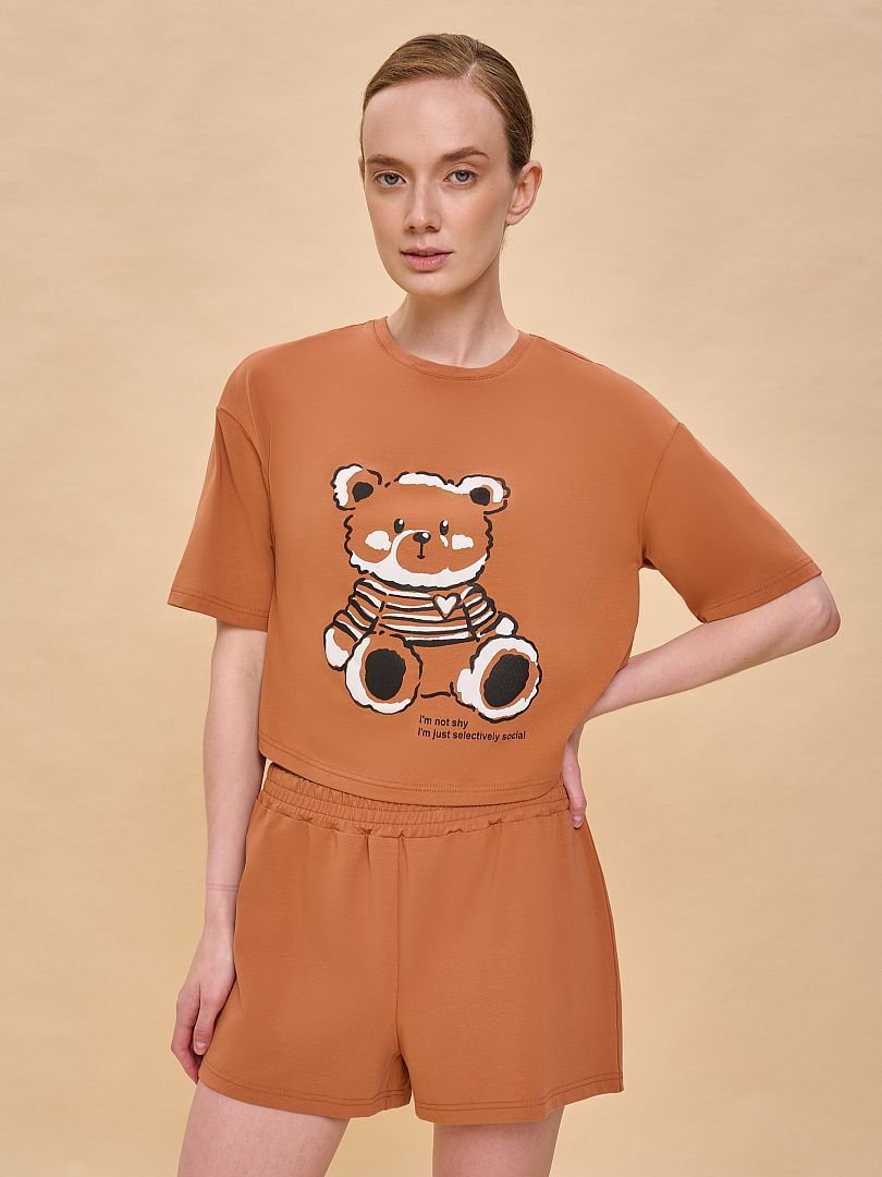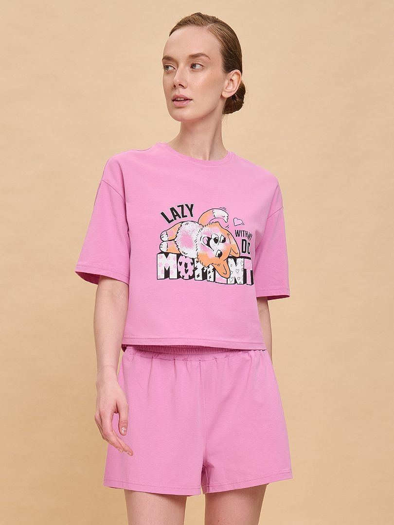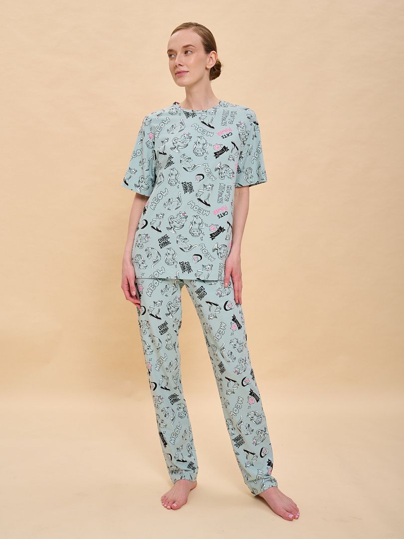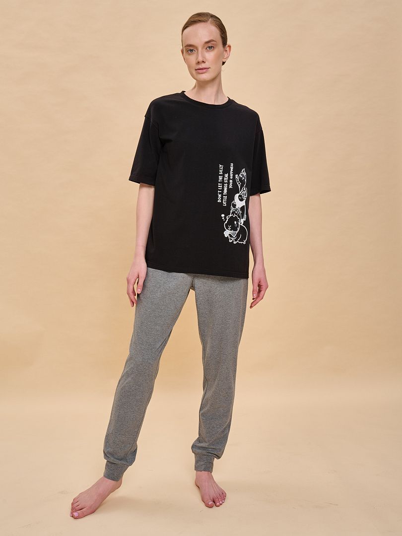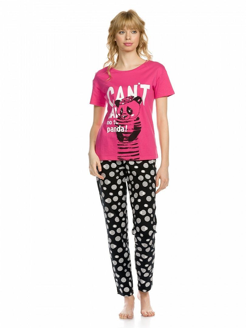 Состав: верх: 60%хлопок 40%полиэстер, низ: 60%хлопок 40%полиэстер Комплект женский: футболка и брюки. Футболка прямого кроя среднего объема с втачным рукавом. Суперстойкий и эластичный принт. Перевод: "Не могу сказать нет панде". Брюки среднего объема на комфортной внутренней резинке.