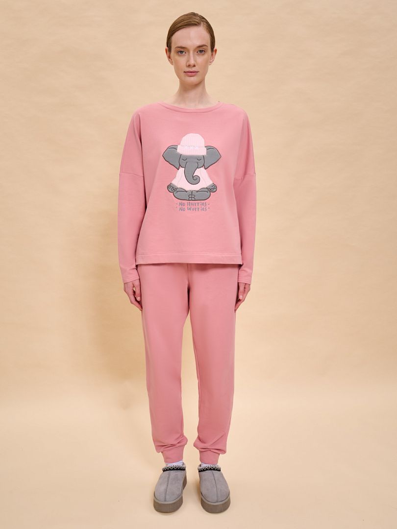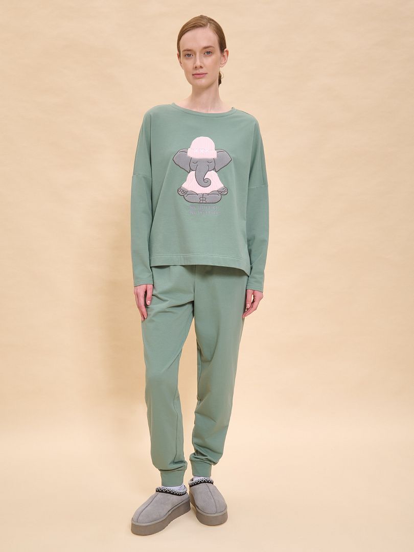 Состав: верх: 95%хлопок 5%эластан, низ: 95%хлопок 5%эластан Теплая пижама женская. В составе ткани (футер с начёсом) преобладает высококачественный хлопок — комплект для сна мягкий, гипоаллергенный и хорошо пропускает воздух. В хлопковой пижаме вам будет тепло и уютно во время сна. Эластан помогает модели надолго сохранить первоначальную форму. Джемпер и брюки умеренного объёма, плечо джемпера спущено, спинка чуть длиннее переда— в пижаме очень удобно спать. В поясе брюк мягкая и широкая резинка — не перекручивается и не давит. Отделка горловины из эластичной рибаны — она не растягивается, пижаму удобно надевать и снимать. Хлопковая пижама украшена милым, «няшным» принтом в виде медитирующего слоника, надписи переводятся: «никакой спешки», «не беспокойтесь» — почувствуйте себя уютно и беззаботно. Шляпка и майка слоника — аппликация из тактильного приятного бербер-флиса с нежной фактурой барашка. Пижамный костюм неприхотлив в уходе. Принт эластичный и мягкий, хорошо переносит частые стирки. Пижама женская с брюками подходит как для сна, так и просто для отдыха дома. Помните о правильном уходе за изделием: рекомендуется стирать при температуре не выше 30 °C, без предварительного замачивания, с изнанки. Это поможет сохранить качество и цвет пижамы на длительное время.Не забывайте о выборе правильного размера. Используйте таблицу размеров на фотографии, чтобы выбрать подходящий для себя вариант.Обратите внимание, что цвет товара на экране вашего устройства может отличаться от реального.