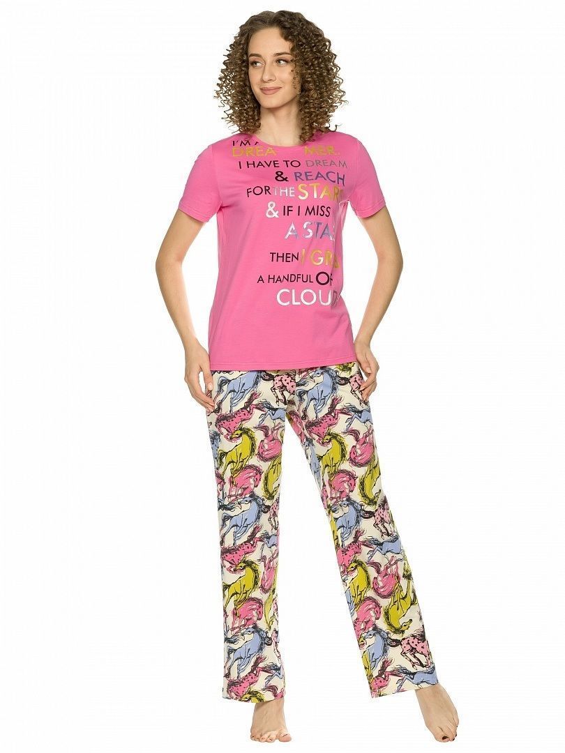 Состав: верх: 95%хлопок 5%эластан, низ: 95%хлопок 5%эластан Комплект женски: футболка и брюки. Футболка прямая, небольшого объема. Шрифтовой принт с разноцветным металликом. Перевод Я мечтатель, я должен мечтать и тянуться к звездам. А если я не могу поймать звезду, я ловлю пригоршню облаков . Брюки прямые, свободные, с высокой линией талии. Мягкий стойкий all over принт динамичные и сказочные лошади.