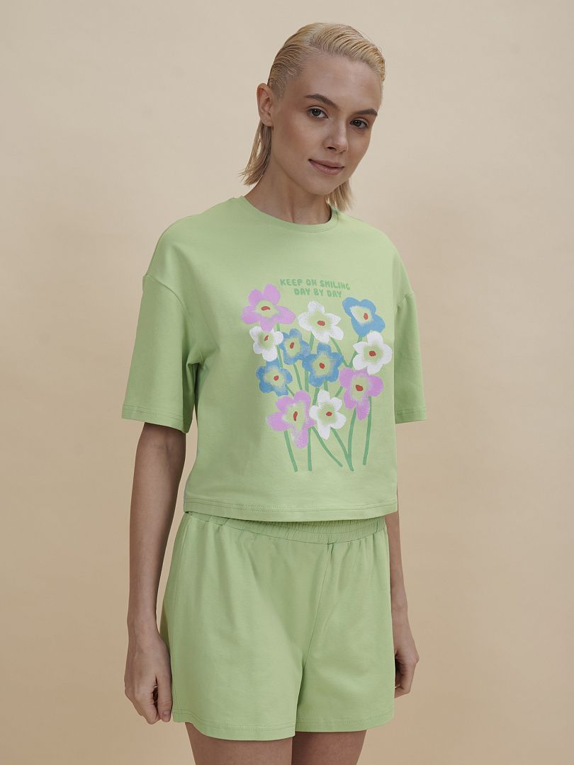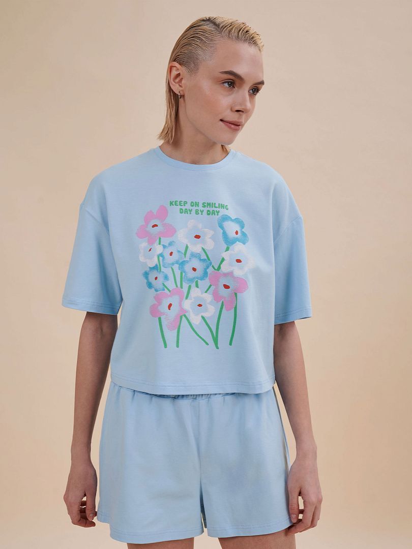 Состав: верх: 92%хлопок 8%эластан, низ: 92%хлопок 8%эластан Домашний комплект женский с шортами и футболкой – комфортная повседневная одежда для дома. Домашняя одежда всегда должна быть изысканной, создавать чувство уверенности и красоты. Кроп-топ модного дизайна дарит комфорт и свободу движений. Короткая майка-футболка с позитивным принтом – стильная деталь женского гардероба. Милый цветочный принт с летним настроением, надпись переводится: "Продолжай улыбаться изо дня в день". Принт эластичный и мягкий, отлично переносит многочисленные стирки. В составе ткани изделия преобладает высококачественный хлопок – пижама мягкая и отлично пропускает воздух, давая коже дышать. Шорты свободного кроя, средней длины – для удобства и комфорта. Шортики женские на широкой эластичной резинке – она не давит и не перекручивается. В линейке представлены следующие размеры: XS (42), S (44), M (46), L (48), XL (50). Женский пижамный костюм подходит как женщинам, так и девушкам, девочкам-подросткам. Модель представлена в трёх актуальных цветах: голубом, зелёном и сиреневом (модный оттенок лаванды). Комплект женский домашний идеален для комфортного сна, пижамной вечеринки. Кроп-топ свободного кроя подходит для повседневного летнего гардероба, прогулок, отдыха. А также пижама хлопковая женская удобна для беременных и кормящих. Домашний женский комплект из футболки и шорт – чудесный подарок для мамы, сестры или подруги на любой праздник. Выбирайте нужный размер по таблице размеров на фото. Цвет товара на экране вашего устройства может отличаться от цвета изделия вживую.