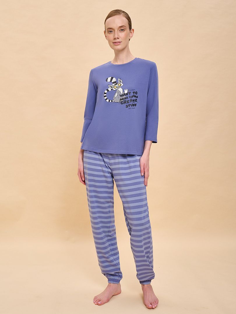Состав: верх: 95%хлопок 5%эластан, низ: 95%хлопок 5%эластан Костюм пижамный женский. В составе ткани преобладает высококачественный хлопок — комплект для сна мягкий, гипоаллергенный и воздухопроницаемый. В хлопковой пижаме вам будет тепло и уютно во время сна. Эластан помогает модели надолго сохранить первоначальную форму. Джемпер и брюки умеренного объёма, плечо немного спущено, рукава широкие и свободные — в пижаме очень удобно спать. В поясе и по низу брюк мягкие и широкие резинки — не перекручиваются и не давят. Отделка горловины из эластичной рибаны — она не растягивается, пижаму удобно надевать и снимать. Хлопковая пижама украшена милым, «няшным» принтом в виде забавного лемура, надписи переводятся: «креативные вещи», «я просто хочу выпить кофе и спать». Брюки в горизонтальную полоску. Пижамный костюм неприхотлив в уходе. Принт эластичный и стойкий, хорошо переносят частые стирки. Пижама женская с брюками подходит как для сна, так и просто для отдыха дома, пижамной вечеринки. Помните о правильном уходе за изделием: рекомендуется стирать при температуре не выше 30 °C, без предварительного замачивания, с изнанки. Это поможет сохранить качество и цвет пижамы на длительное время.Не забывайте о выборе правильного размера. Используйте таблицу размеров на фотографии, чтобы выбрать подходящий для себя вариант.Обратите внимание, что цвет товара на экране вашего устройства может отличаться от реального.