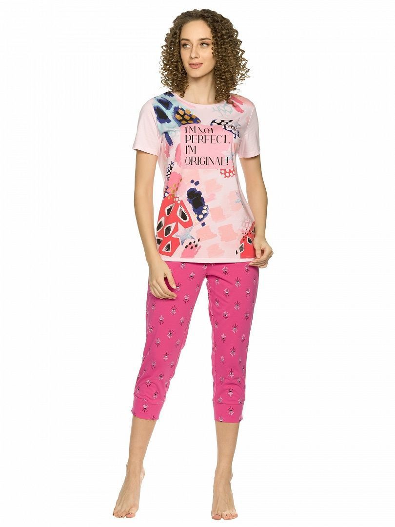 Состав: верх: 57%хлопок 38%полиэстер 5%эластан, низ: 57%хлопок 38%полиэстер 5%эластан Комплект женский футболка и брюки. Футболка прямого кроя среднего объема. Мягкий стойкий принт с золотым металликом. Перевод Я не идеальная, я оригинальная.. Бриджи комфортного объема. По талии на плоской внутренней резинке, по низу манжеты шириной 7 см., all over принт.