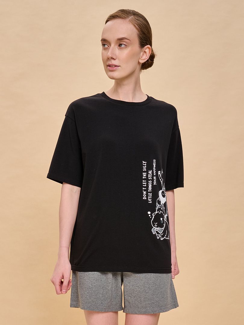 Состав: верх: 95%хлопок 5%эластан, низ: 95%хлопок 5%эластан Пижама женская с шортами. В составе ткани преобладает высококачественный хлопок — комплект для сна мягкий, гипоаллергенный и хорошо пропускает воздух. В хлопковой пижаме вам будет комфортно и уютно во время сна. Эластан помогает модели надолго сохранить первоначальную форму. Футболка силуэта оверсайз, плечо спущено, рукава широкие и удлинённые — в пижаме очень удобно спать. В поясе шорт мягкая и широкая резинка — не перекручивается и не давит. Отделка горловины из эластичной рибаны — она не растягивается, пижаму удобно надевать и снимать. Хлопковая пижама украшена милым, «няшным» принтом в виде забавных зверушек с позитивным настроением, надпись переводится: «не позволяй глупым вещам воровать твоё счастье» — почувствуйте себя беззаботной девчонкой. В принте есть модный оттенок — серебритсый металлик. Пижамный костюм неприхотлив в уходе. Принт эластичный и мягкий, легко переносит частые стирки. Милая пижама подходит как для сна, так и просто для отдыха дома, пижамной вечеринки. Помните о правильном уходе за изделием: рекомендуется стирать при температуре не выше 30 °C, без предварительного замачивания, с изнанки. Это поможет сохранить качество и цвет пижамы на длительное время.Не забывайте о выборе правильного размера. Используйте таблицу размеров на фотографии, чтобы выбрать подходящий для себя вариант.Обратите внимание, что цвет товара на экране вашего устройства может отличаться от реального.