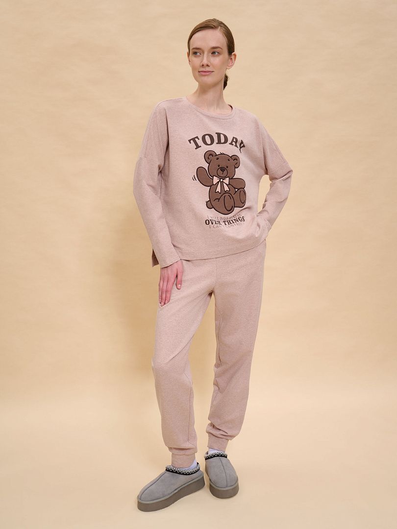 Состав: верх: 95%хлопок 5%эластан, низ: 95%хлопок 5%эластан Теплая пижама женская. В составе ткани (футер с начёсом) преобладает высококачественный хлопок — комплект для сна мягкий, гипоаллергенный и хорошо пропускает воздух. В хлопковой пижаме вам будет тепло и уютно во время сна. Эластан помогает модели надолго сохранить первоначальную форму. Джемпер и брюки умеренного объёма, плечо джемпера спущено, спинка чуть длиннее переда— в пижаме очень удобно спать. В поясе брюк мягкая и широкая резинка — не перекручивается и не давит. Отделка горловины из эластичной рибаны — она не растягивается, пижаму удобно надевать и снимать. Хлопковая пижама украшена милым, «няшным» принтом в виде плюшевого медвежонка, надпись переводится: «сегодня я не буду переживать из-за того, что не могу контролировать» — просто позвольте себе побыть счастливым ребёнком. Пижамный костюм неприхотлив в уходе. Принт эластичный и мягкий, хорошо переносит частые стирки. Пижама женская с брюками подходит как для сна, так и просто для отдыха дома. Помните о правильном уходе за изделием: рекомендуется стирать при температуре не выше 30 °C, без предварительного замачивания, с изнанки. Это поможет сохранить качество и цвет пижамы на длительное время.Не забывайте о выборе правильного размера. Используйте таблицу размеров на фотографии, чтобы выбрать подходящий для себя вариант.Обратите внимание, что цвет товара на экране вашего устройства может отличаться от реального.