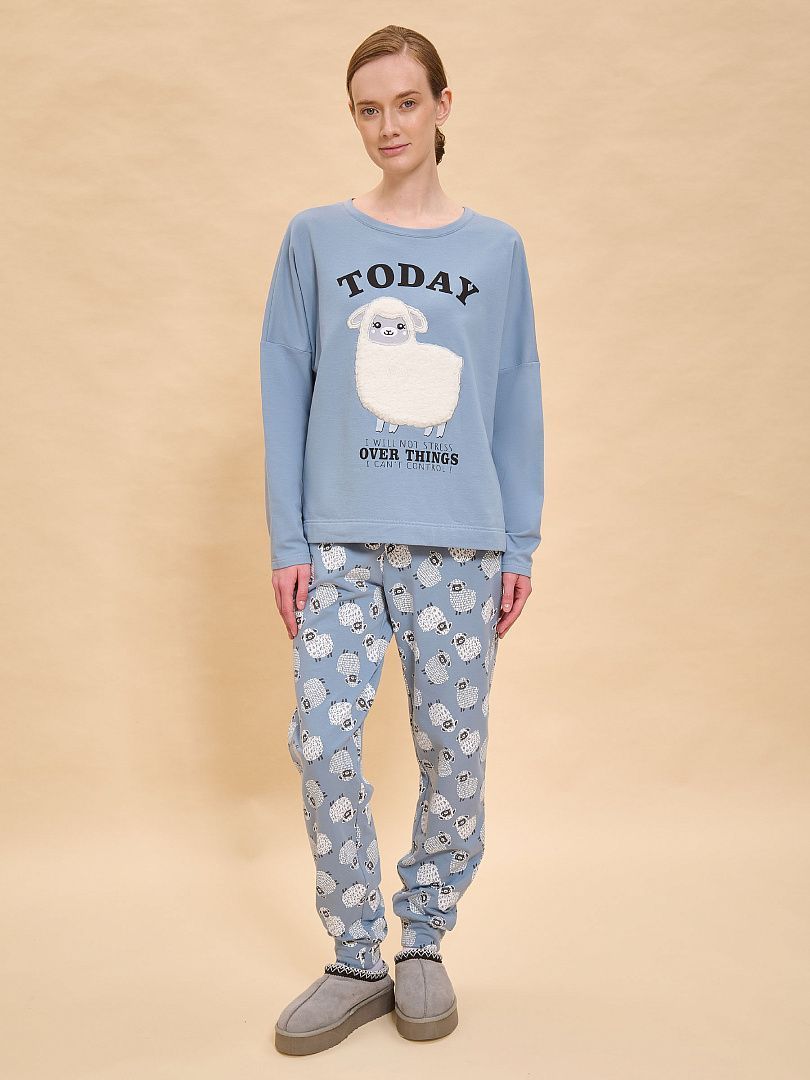 Состав: верх: 95%хлопок 5%эластан, низ: 95%хлопок 5%эластан Костюм женский их футера с начесом: толстовка и брюки. Теплая, мягкая, приятная на ощупь ткань с 95% хлопка в составе – почти не мнется, сохраняет форму даже после частых стирок. Свободный крой толстовки и спущенное плечо – комфортный и модный оверсайз. Оригинальное решение - объемная нашивка из любимого тедди-флиса в виде милейшей овечки, которая перекликается с принтом на штанах. Большой объем брюк в области бедер и сужение книзу за счет манжетов из основной ткани делают брюки удобными в носке. Домашний утепленный комплект отлично подходит на осенне-зимний сезон, а также согреет на природе прохладными летними вечерами.