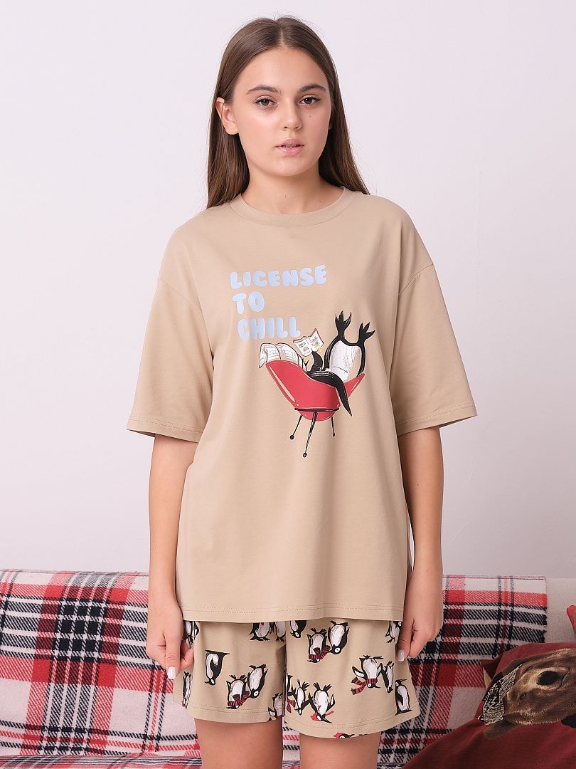 Состав: верх: 95%хлопок 5%эластан, низ: 95%хлопок 5%эластан Пижама женская с шортами. В составе ткани преобладает высококачественный хлопок — домашняя пижама мягкая, гипоаллергенная и хорошо пропускает воздух. В пижаме вам будет комфортно и уютно во время сна. Эластан помогает модели надолго сохранить первоначальную форму. Футболка свободная, плечо спущено, рукава широкие — в пижаме очень удобно спать. В поясе шорт мягкая и широкая резинка — не перекручивается и не давит. Отделка горловины из эластичной рибаны — она не растягивается, пижаму удобно надевать и снимать. Костюм домашний женский украшен прикольным принтом, надпись переводится: «лецензия на чилл» — поймайте позитивное настроение! Домашний комплект с шортами неприхотлив в уходе. Принты эластичные и прочные, без проблем переносит частые стирки. Помните о правильном уходе за изделием: рекомендуется стирать при температуре не выше 30 °C, без предварительного замачивания, с изнанки. Это поможет сохранить качество и цвет пижамы на длительное время.Не забывайте о выборе правильного размера. Используйте таблицу размеров на фотографии, чтобы выбрать подходящий для себя вариант.Обратите внимание, что цвет товара на экране вашего устройства может отличаться от реального.