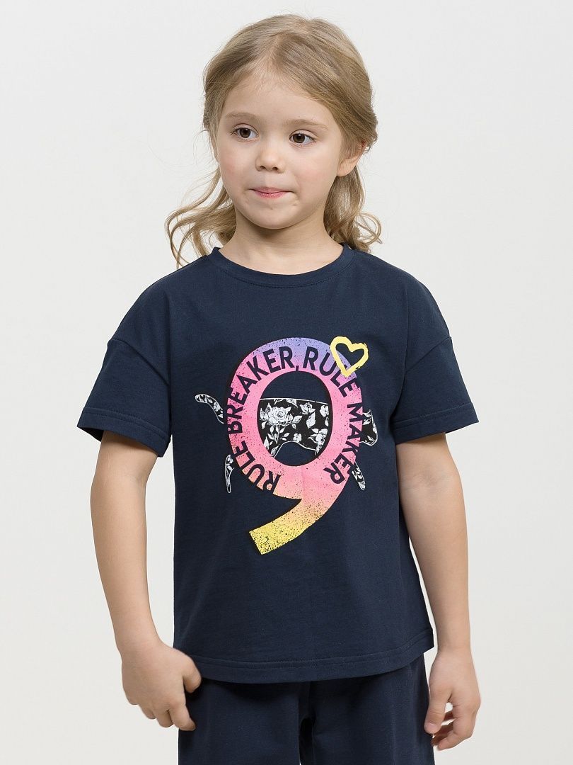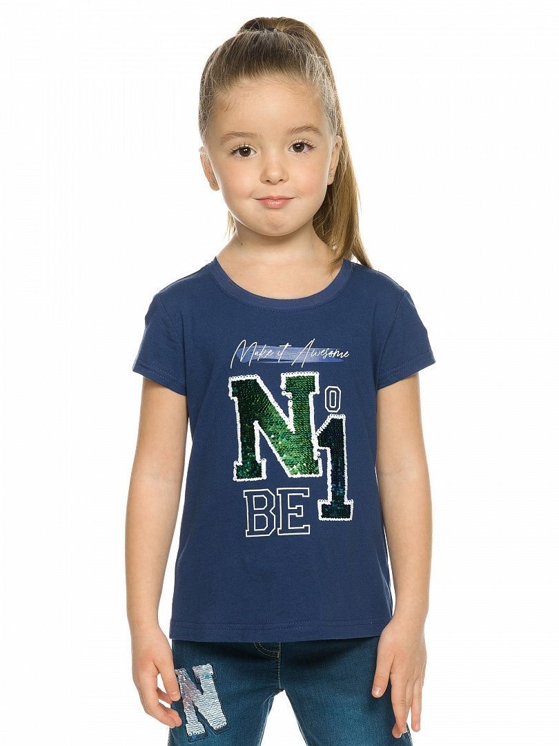 Состав: 100%хлопок Футболка умеренного объёма с втачным рукавом. Вырез горловины круглый и декорирован полосатой рибаной. Принт с вышивкой переливающимися переворачивающимися пайетками, перевод Будь первой , и надписью, перевод Делай это потрясно .