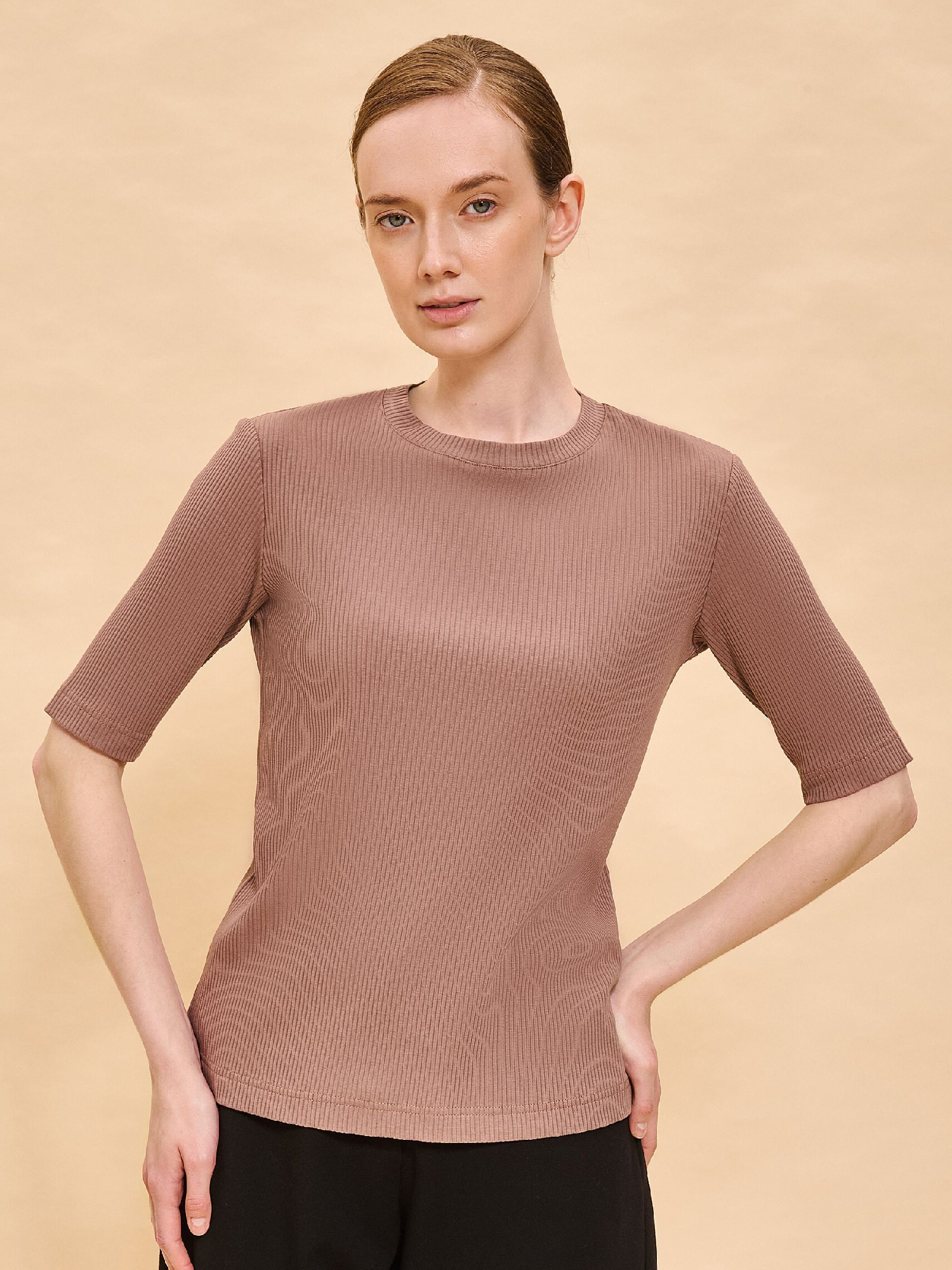Состав: 58%хлопок 37%вискоза 5%эластан Футболка однотонная женская. Комфортная мягкая майка небольшого объёма станет отличным дополнением вашего повседневного гардероба. Модель выполнена из эластичной рибаны (ткань в рубчик), вырез горловины также обработан рибаной — она прекрасно держит форму, не растягивается, при этом футболку удобно надевать и снимать. Базовая футболка с рукавом длиной до локтя — актуальный тренд сезона. Изделие неприхотливо в уходе. Модель лаконичного дизайна, без принта. В составе ткани преобладают высококачественный хлопок и вискоза — майка мягкая, дышащая, приятная на ощупь. Эластан помогает сохранить первоначальную форму в течение длительного времени. Однотонная футболка выполнена в универсальных цветах, её легко комбинировать с различными брюками, шортами, юбками. Футболка женская без принта — базовый элемент гардероба, пригодится в любой ситуации. Однотонная футболка женская подходит для любого времени года, её можно носить как летом, так и в холодное время года в качестве среднего слоя одежды, а также на спорт. Помните о правильном уходе за изделием: рекомендуется стирать при температуре не выше 30 °C, без предварительного замачивания, с изнанки. Это поможет сохранить качество и цвет футболки на длительное время.Не забывайте о выборе правильного размера. Используйте таблицу размеров на фотографии, чтобы выбрать подходящий для себя вариант.Обратите внимание, что цвет товара на экране вашего устройства может отличаться от реального.