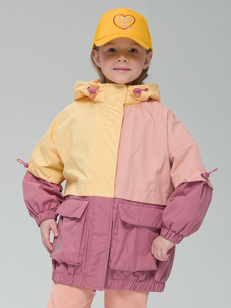 Состав: 100%полиэстер + мембрана, подклад: 100%полиэстер, утеплитель: 100%полиэстер Утепленная удлиненная ветровка для девочки прямого силуэта, со спущенным плечом объемного силуэта с температурным режимом не ниже +5°С. Наличие в составе ткани мембраны делает куртку максимально комфортной при носке. МНОГОЗОНАЛЬНЫЙ ПОДКЛАД - уютный флис в капюшоне, воротнике и по стану; утеплитель из легкого синтепона (40 г/м2) в рукавах и ниже линии талии. ПОДКЛАД ИЗ ПОЛИЭСТЕРА необходим для лёгкого надевания изделия, обладает легкой степенью грязеотталкивания. Чтобы вашему ребенку было тепло и удобно. Водоотталкивающая пропитка (DWR) наносится на внешнюю поверхность ткани и задерживает грязь и влагу снаружи. Дополнительный слой на внутренней стороне ткани не позволяет ребенку промокнуть. Сочетание двух расцветок ткани - имитация многослойности, актуальный тренд сезона. Верх ткани имитирует кроп-топ. Цельнокроеный 2-шовный капюшон с улучшенной посадкой по форме головы не отстегивается. Объём капюшона регулируется двухцветным шнуром, который вставлен в настроченную поверху кулису. На шнурах декор, который хо