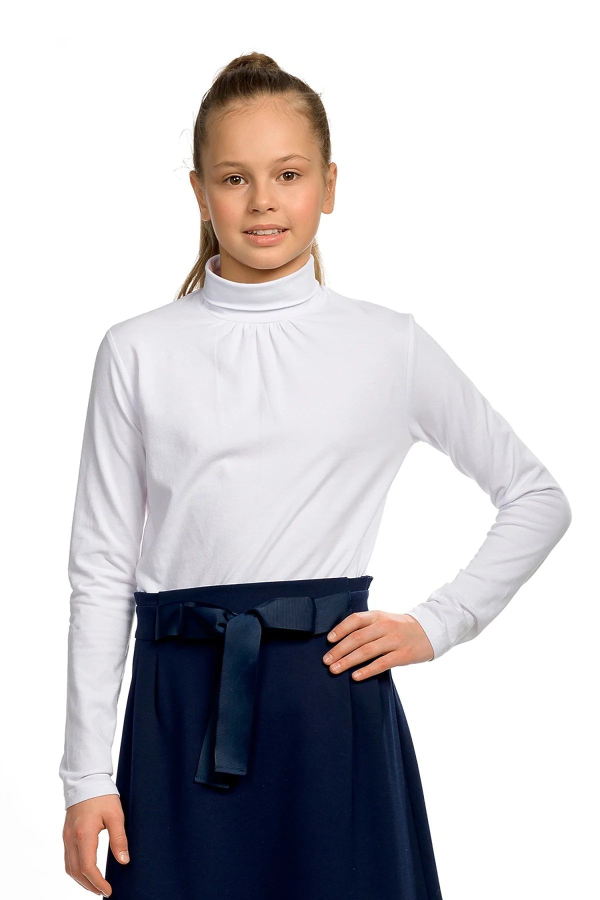 Состав: 93%хлопок 7%эластан Водолазка для девочки школьная с длинным рукавом. Трикотажная водолазка, комфортно облегающая фигуру и лишенная застежек, придает ребёнку свободу движений и лёгкость в носке. Благодаря преобладающему содержанию высококачественного хлопка, она обеспечивает превосходную воздухопроницаемость, а эластан сохраняет форму изделия долгое время, не допуская его растяжения. Водолазка школьная представляет собой идеальное сочетание минимализма и изящества, украшенного лишь декоративной сборкой у горловины спереди. Базовая белая водолазка для девочки — универсальное решение, которое легко сочетается с различными элементами гардероба, будь то брюки, юбки или сарафаны. Это не просто одежда, это возможность создавать многообразные образы для любого случая — от повседневного до торжественного. Водолазка детская — это не просто выбор для школы, это инвестиция в стиль и комфорт вашего ребёнка. Рекомендуемый уход за изделием обеспечит его долговечность и сохранение первоначального внешнего вида даже после многократных стирок: стирать при температуре не выше 30 °C, без предварительного замачивания, с изнанки, а затем расправить перед сушкой. Не забудьте выбрать нужный размер, ориентируясь на таблицу размеров на фото. И помните, что цвет изделия на экране вашего устройства может незначительно отличаться от его реального цвета.