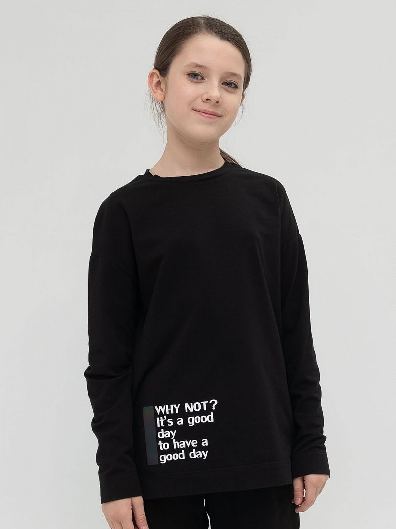 Состав: 93%хлопок 7%эластан Джемпер для девочки в школу из приятного к телу материала. Он не тянется, легко стирается и подходит для ежедневной носки. Текстовый принт Почему нет? Сегодня хороший день, чтобы у тебя был хороший день (дословный перевод) создаст положительный настрой.А серая светоотращающая полоска становится разноцветной при фотовспышке.Необычный крой, принты, лаконичный дизайн то, что оценят современные дети.