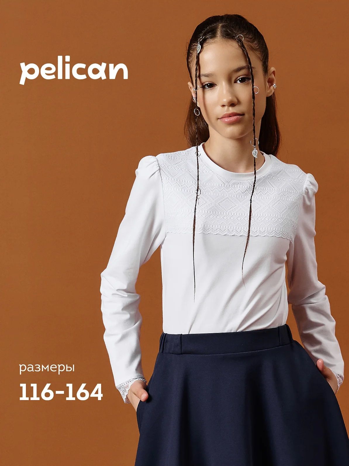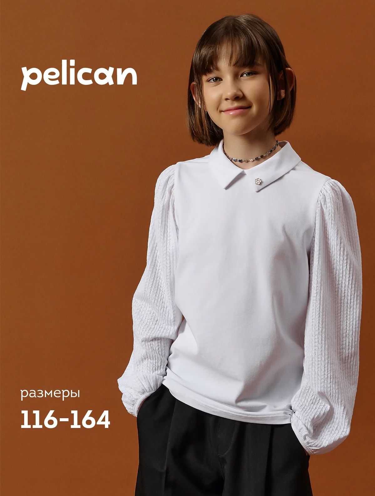 Состав: 93%хлопок 7%эластан, вставка:1 85%нейлон 15%эластан, вставка:2 90%полиамид 10%эластан Элегантная блузка для школы от бренда Pelican выполнена из качественного хлопкового трикотажа с добавлением эластана — материал мягкий, эластичный и приятный к телу. Блузка идеально подходит как для повседневной носки, так и для школьных линеек, праздничных мероприятий и фотосессий.По верху переда настрочено широкое кружево, создающее эффект кокетки — утончённый элемент, который делает блузку нарядной, оставаясь в рамках школьной формы.Воротник-стойка застёгивается на пуговицу и петельку из узкой резинки, сзади — разрез, который облегчает надевание.Рюша из мягкой сетки делает воротник визуально более изящным, смягчая строгую форму, а аккуратный бант по центру подчёркивает школьный стиль и добавляет нотку нарядности.Лёгкий рукав из мягкой сетки — выглядит воздушно, смотрится празднично, а главное — не колется и не мешает в движении. Идеальное сочетание моды и комфорта для школы.Используйте таблицу размеров на фотографии, чтобы выбрать подходящий размер. Обратите внимание, что цвет товара на экране вашего устройства может отличаться от реального.