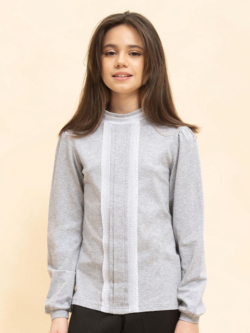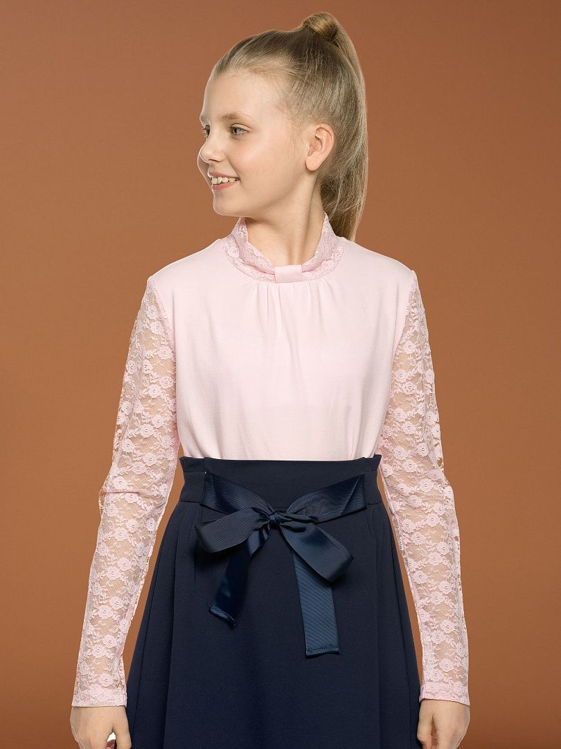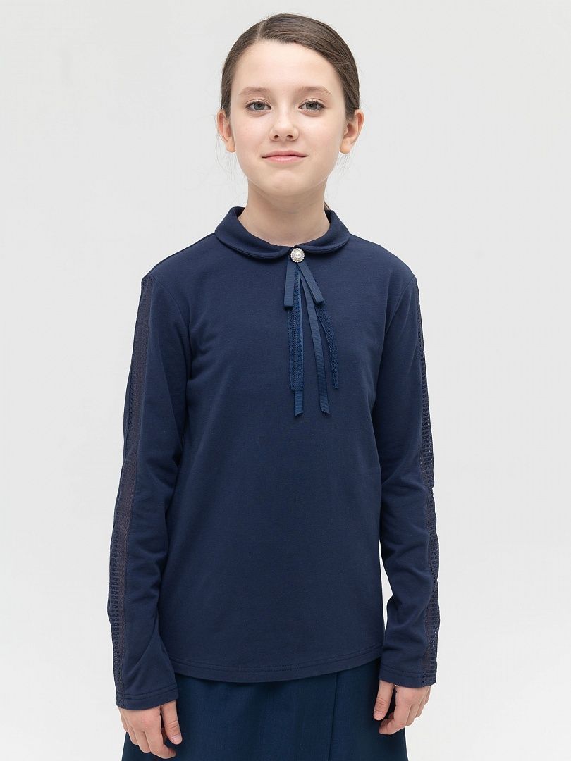 Состав: 93%хлопок 7%эластан, вставка: 90%полиамид 10%эластан Школьный джемпер из хлопкового трикотажа. Мягкая, комфортная ткань хорошо держит форму и не растягивается. Эластичное кружево по рукаву, круглый воротник с бантом из репсовых и кружевных лент, закрепленный пуговицей с жемчужиной и стразами стильные фишки этой модели. Удобная застёжка сзади воротника позволит легко надеть джемпер и не испортить причёску. Этот красивый практичный джемпер станет любимым в гардеробе юной модницы.