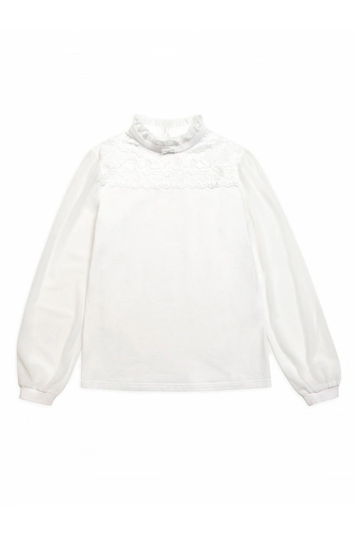 Состав: 93%хлопок 7%эластан, вставка: 90%полиамид 10%эластан Нарядный джемпер для девочки. Основная ткань с большим содержанием хлопка, мягкая, приятная на ощупь. Воротник-стойка и рукава сшиты из мягкого, тонкого, но прочного кружева. Комфортно носить, просто ухаживать. Воротник-стойка фиксируется декоративной петлей из основной ткани, благодаря которой горловина не вытягивается и отлично держит форму. Джемпер позволяет создать стильный школьный образ и подходит для торжественных случаев.