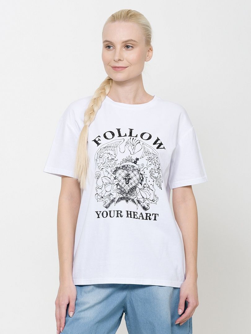 Состав: 95%хлопок 5%эластан Футболка большого объема. Суперпрочный принт с глиттером и стразами. Перевод Следуй за своим сердцем.