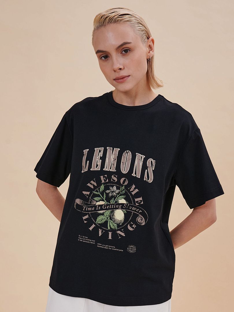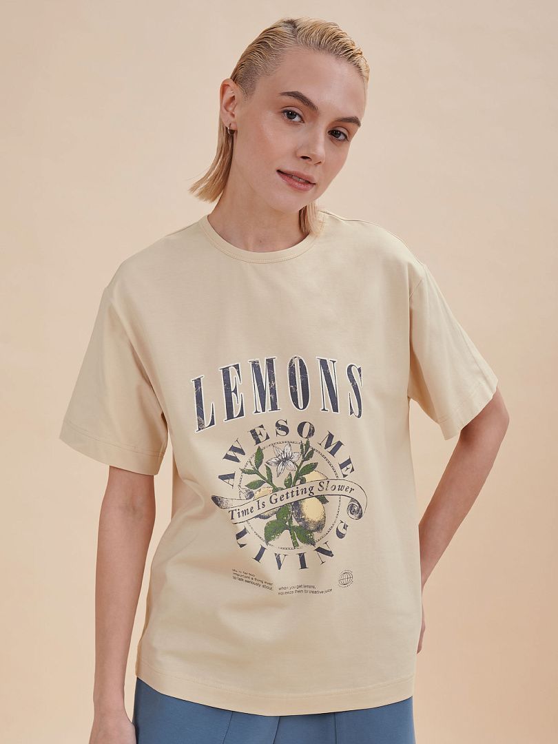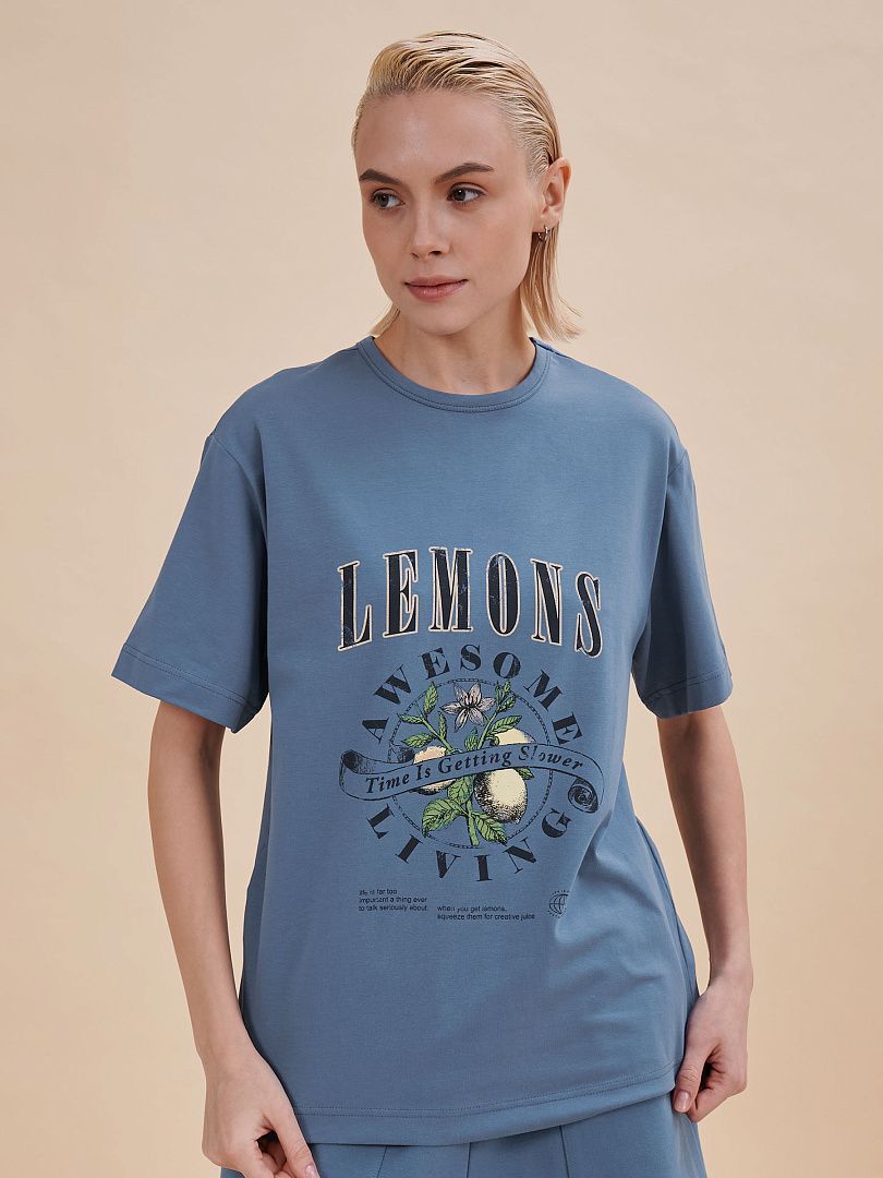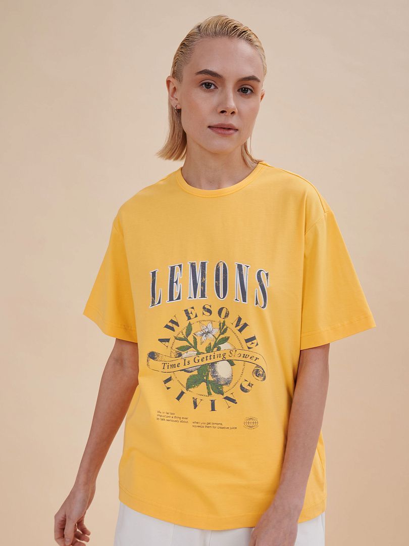 Состав: 95%хлопок 5%эластан Женская футболка с принтом. Стильная и удобная футболка среднего объема со спущенным плечом подарит вам комфорт и свободу движения. Джемпер такого силуэта скрывает недостатки фигуры и подчёркивает достоинства. Майка с прямыми рукавами идеальна для повседневной носки. Она неприхотлива в уходе. Трикотажная футболка украшена трендовым принтом в духе садоводческих клубов по переду. Надписи переводятся: "лимоны", "потрясающее времяпрепровождение", "время идёт медленнее", "жизнь — слишком серьёзная штука, чтобы говорить о ней всерьёз", "когда вы возьмёте лимоны, выжмите из них творческие соки", "жизнь хороша", "просто добавь воды". Принт качественный и стойкий — без проблем переносит многочисленные стирки. В составе ткани преобладает высококачественный хлопок — футболка мягкая, приятная на ощупь и позволяет коже дышать. Эластан помогает изделию надолго сохранить первозданную форму. Джемпер представлен в следующих актуальных цветах: чёрный, голубой, синий, жёлтый, кремовый, зелёный, белый. Размерная линейка: XS (42); S (44); M (46); L (48); XL (50). Идеально и для женщин, и для девушек, и для девочек-подростков. Базовая футболка среднего объёма универсальна, отлично подходит для работы, учёбы, спорта, прогулок, отдыха, а также для дома и сна. Хлопковая футболка легко сочетается с различными брюками, юбками и шортами. Её можно носить летом, зимой и в демисезон (осенью и весной). Модная футболка — это прекрасный подарок сестре, подруге или маме на любой праздник. Выбирайте нужный размер по таблице размеров на фото. Цвет товара на экране вашего устройства может отличаться от цвета изделия вживую.