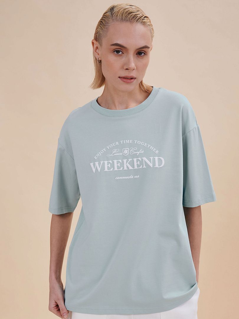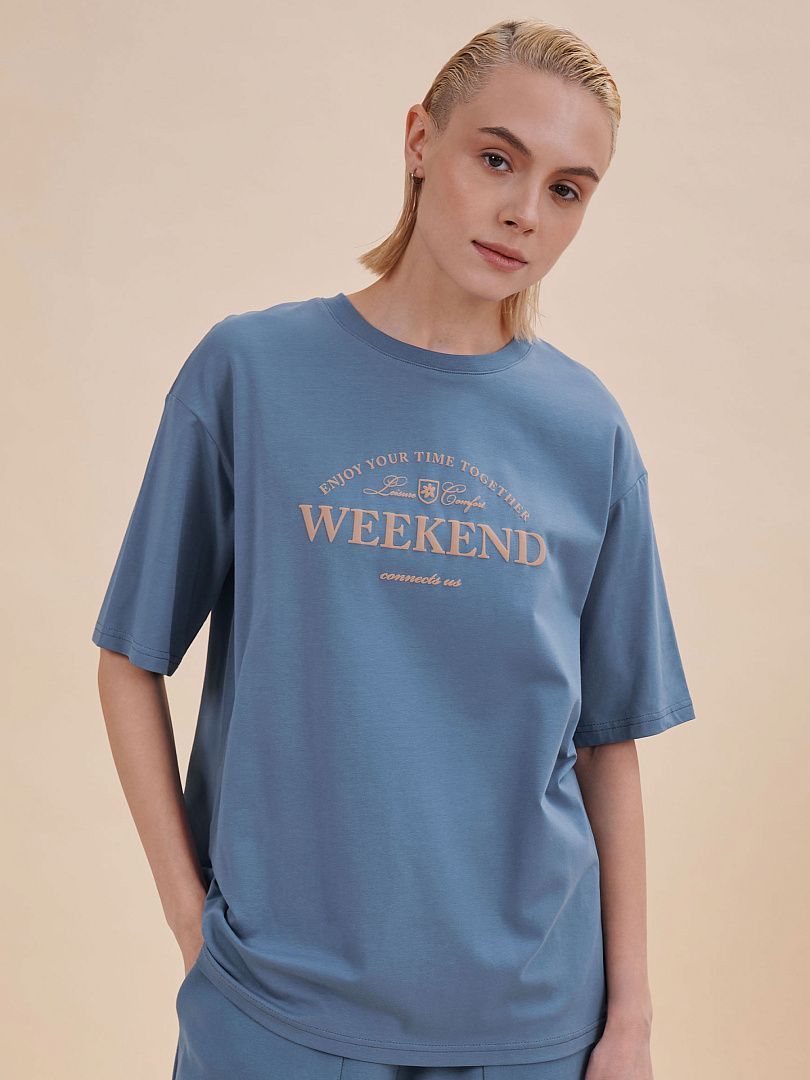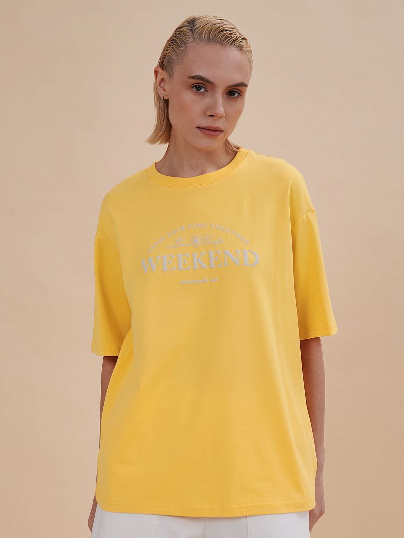 Состав: 95%хлопок 5%эластан Женская футболка с принтом. Футболка оверсайз со спущенным плечом подарит вам комфорт и свободу движения. Джемпер такого силуэта скрывает недостатки фигуры и подчёркивает достоинства. Майка с удлинёнными широкими рукавами — один из актуальных модных трендов сезона. Она неприхотлива в уходе. Трикотажная футболка украшена трендовым принтом в университетском стиле по переду, надписи переводится: "наслаждайтесь временем, проведённым вместе", "досуг, комфорт", "выходные на объединяют". Принт качественный и стойкий — без проблем переносит многочисленные стирки. В составе ткани преобладает высококачественный хлопок — футболка мягкая, приятная на ощупь и позволяет коже дышать. Эластан помогает изделию надолго сохранить первозданную форму. Джемпер представлен в следующих актуальных цветах: чёрный, голубой, синий, жёлтый, белый, зелёный, бежевый. Размерная линейка: XS (42); S (44); M (46); L (48); XL (50). Модель идеальна и для женщин, и для девушек, и для девочек-подростков. Базовая футболка оверсайз универсальна, отлично подходит для работы, учёбы, спорта, прогулок, отдыха, а также для дома и сна. Хлопковая футболка легко сочетается с различными брюками и шортами. Её можно носить летом, зимой и в демисезон (осенью и весной). Модная футболка— это прекрасный подарок сестре, подруге или маме на любой праздник. Выбирайте нужный размер по таблице размеров на фото. Цвет товара на экране вашего устройства может отличаться от цвета изделия вживую.