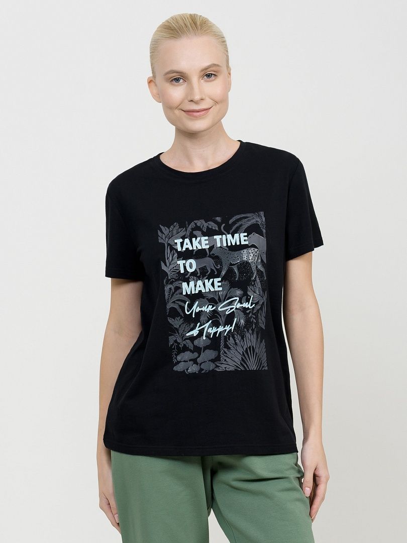 Состав: 95%хлопок 5%эластан Футболка маленького объема. Rubber принт с игрой матовых и глянцевых фактур. Перевод Найдите время, чтобы сделать свою душу счастливой.