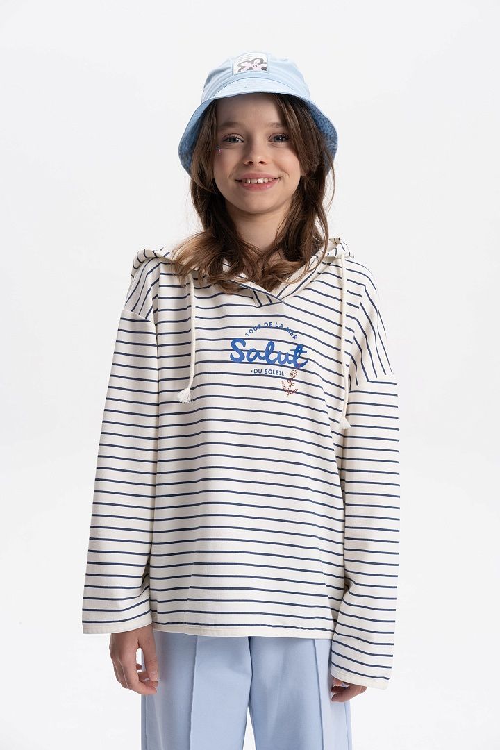 Состав: 96%хлопок 4%эластан Свитшот в полоску с принтом тельняшка, подходит для девочки подростка. Модный джемпер из высококачественного хлопкового футера можно носить круглый год весной, летом, осенью и зимой. Кофта с капюшоном подойдет для повседневной носки на занятия, в школу, в сад и на прогулку.Идеально для подарка на любой праздник.