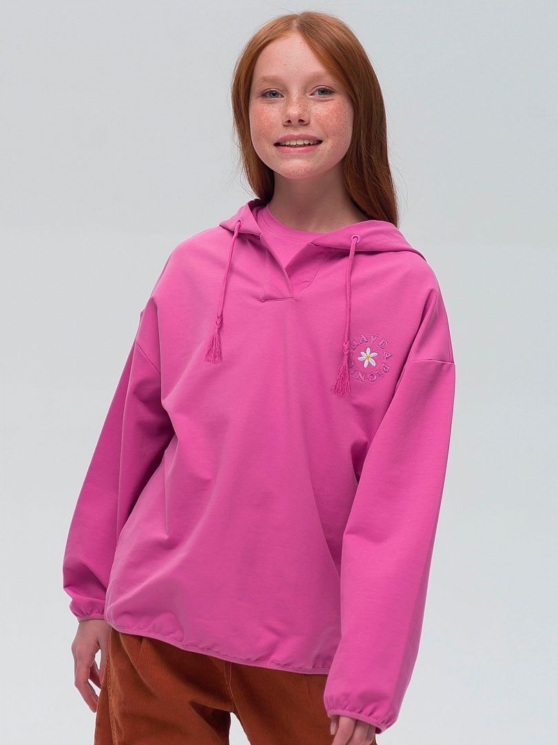 Состав: 95%хлопок 5%эластан Худи оверсайз из футера для девочки. Натуральный хлопок и 5% эластана в составе – тело дышит, ткань меньше мнется и дольше сохраняет аккуратный внешний вид. Широкие рукава, сильно спущенное плечо и свободный крой – настоящий трендовый оверсайз. Теплый и удобный капюшон – объем регулируется плетеным шнуром с декоративными кисточками. Тонкая эластичная обработка низа рукава и изделия – держит форму, мягко облегает, комфортно носится. Цветная вышивка спереди для позитивного настроения. Худи составляет гармоничный дуэт с джоггерами или велосипедками. Идеально для активного детства – на каждый день, для учебы и занятия спортом.