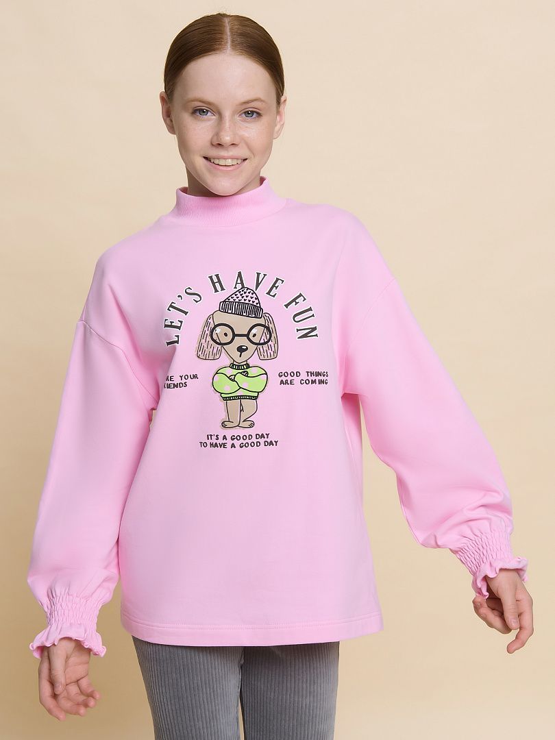 Состав: 95%хлопок 5%эластан Свитшот с воротником для девочки свободного кроя со спущенным плечом. Объёмный детский свитшот подойдёт девочкам с разными типами фигуры. Оверсайз-свитшот дополнен воротником-стойкой, который обеспечивает дополнительную защиту шеи от холода и ветра. Воротник выполнен из эластичной рибаны (ткань в рубчик) — он прекрасно тянется, ребёнку удобно надевать и снимать свитшот, при этом воротник отлично сохраняет форму. Низ рукавов собран на тонкую резинку в несколько рядов, что придаёт изделию элегантности и женственности. Свитшот детский неприхотлив в уходе. Плотный премиальный трикотаж (футер с начесом): не вытягивается, не закатывается. Благодаря эластану изделие сохраняет первоначальную форму в течение долгого времени. Свитшот с принтом по переду. Милый принт в модном университетском стиле изображает забавную собачку в очках, надписи переводятся: «давайте веселиться», «вдохновляйте своих друзей», «хорошие события приближаются», «это хороший день, чтобы был хороший день». Принты эластичные и прочные — без проблем переносят многочисленные стирки. Джемпер выполнен в универсальном цвете, его просто комбинировать с любыми брюками, легинсами, джинсами и даже юбками — можно создать множество стильных образов. Свитшот с начёсом подходит девочкам дошкольного возраста, младшим школьницам и девочкам-подросткам. Его можно носить в детский сад, на прогулки, во время отдыха, а также дома. Помните о правильном уходе за изделием: рекомендуется стирать при температуре не выше 30 °C, без предварительного замачивания, с изнанки. Это поможет сохранить качество и цвет свитшота на длительное время.Не забывайте о выборе правильного размера. Используйте таблицу размеров на фотографии, чтобы выбрать подходящий вариант для вашей девочки.Обратите внимание, что цвет товара на экране вашего устройства может отличаться от реального.