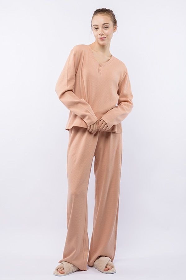 Состав: 100% хлопок. Домашний костюм OVERSIZE из эластичного вафельного трикотажа розово-бежевого цвета состоит из лонгслива и широких брюк. Лонгслив с V-образным вырезом с 2 пуговицами, отделка горловины из материала изделия. Рукав длинный без манжет, подгиб и плоский шов по запястью и низу изделия. Брюки на широкой резинке со шнурком. Подгиб и плоский шов по низу брюк. XS-XS(170-84-90), S-S(170-88-94), M-M(170-92-98), L-L(170-96-102), XL-XL(170-100-106)