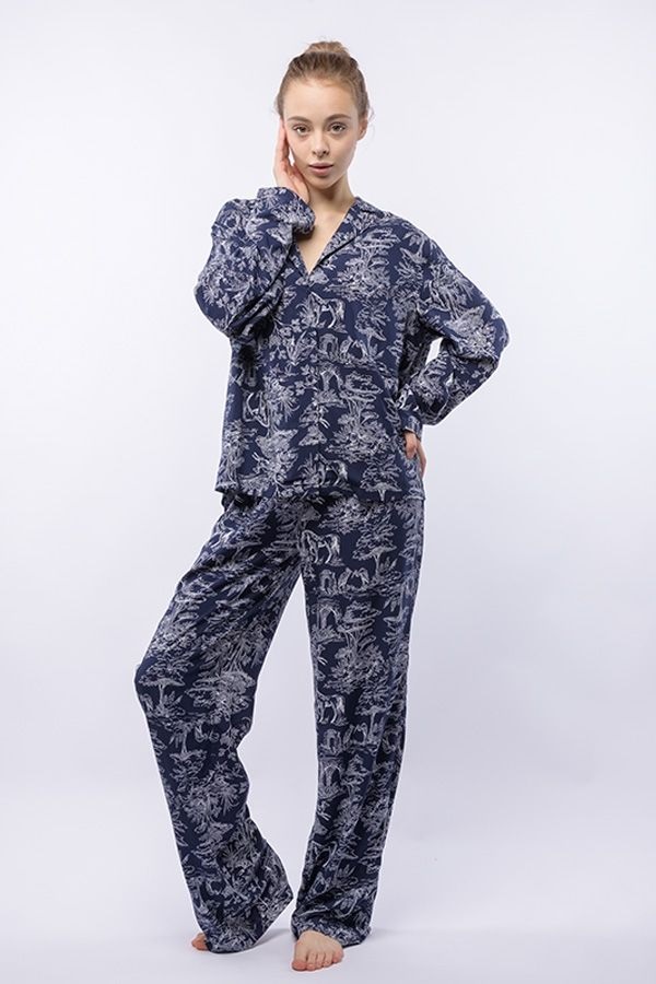 Состав: 100% вискоза. Домашний костюм из тканой вискозы состоит из рубашки и длинных широких брюк. Принт : «Туаль де Жуи» (Toile de Jouy) — это французская ткань с одноцветным рисунком в белых тонах на синем фоне, изображающим пасторальные сцены, пейзажи или сцены из жизни XVIII века. Рубашка с английским воротником, на пуговицах, с длинным рукавом без манжет. Брюки на резинке. Подгиб и строчка по низу рукава и рубашки и низу брюк. XS-XS(170-84-90), S-S(170-88-94), M-M(170-92-98), L-L(170-96-102), XL-XL(170-100-106)