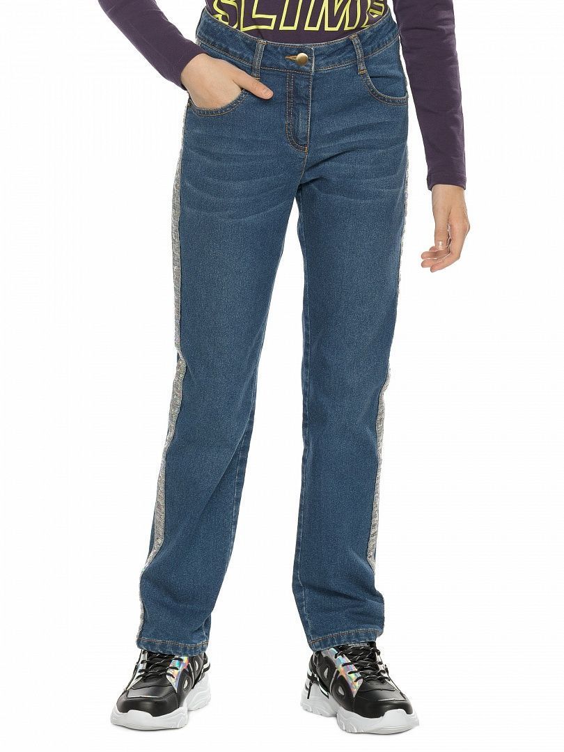 Состав: 65%хлопок 33%полиэстер 2%эластан Джинсы для девочек с начёсом прямого силуэта, по бокам брючин декоративная капроновая тесьма с пайетками, по переду изделия золотистый карабин с принтованной репсовой тесьмой, перевод надписи Доверяй своему творчеству, пояс с внутренней регулировкой шнурком.