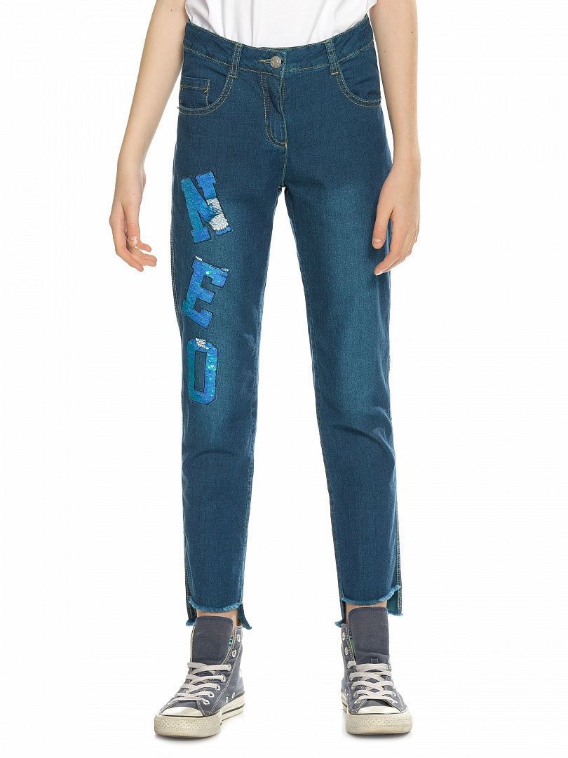 Состав: 98%хлопок 2%эластан Джинсы для девочек. Новинка. Джинсы прямого силуэта SLIM из нового облегченного материала. Перепад длин по спинке и переду и необработанный низ в стиле деконструктивизм. Правая половинка джинсов украшена буквами-нашивками из переливающихся переворачивающихся пайеток. Полукруглые боковые карманы спереди и накладные карманы на спинке, металлическая фурнитура.
