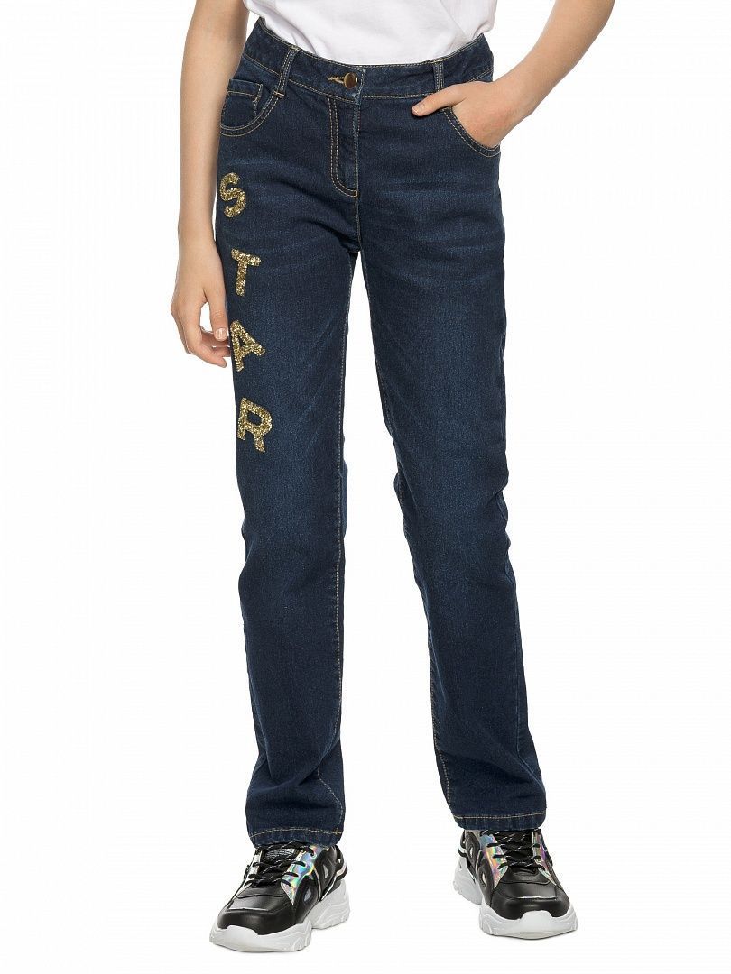 Состав: 65%хлопок 33%полиэстер 2%эластан Прямые джинсы для девочек с начёсом из эластичного денима, слим силуэт, металлическая фурнитура, пояс с регулировкой ширины эластичным шнуром. Правая половина декорирована сверкающей аппликацией из страз. Перевод надписи Звезда.