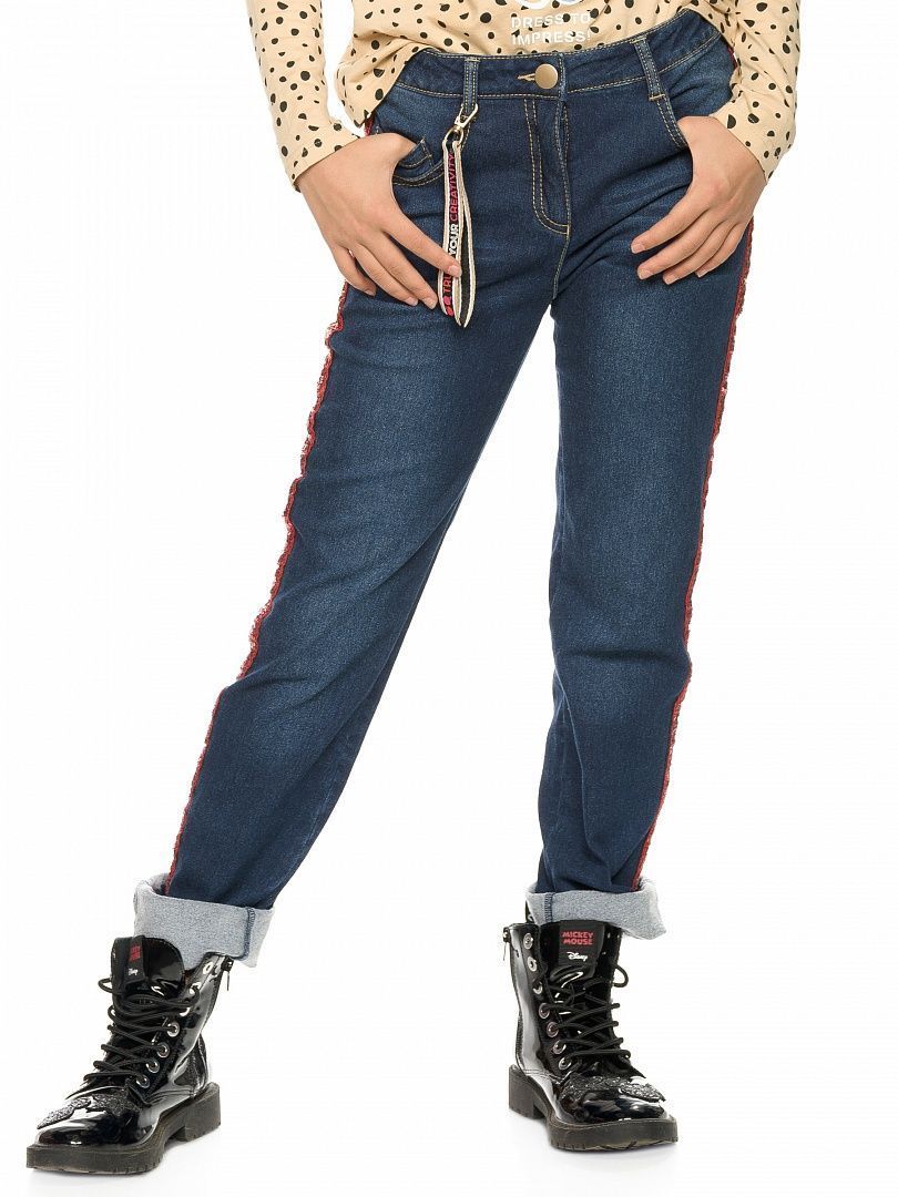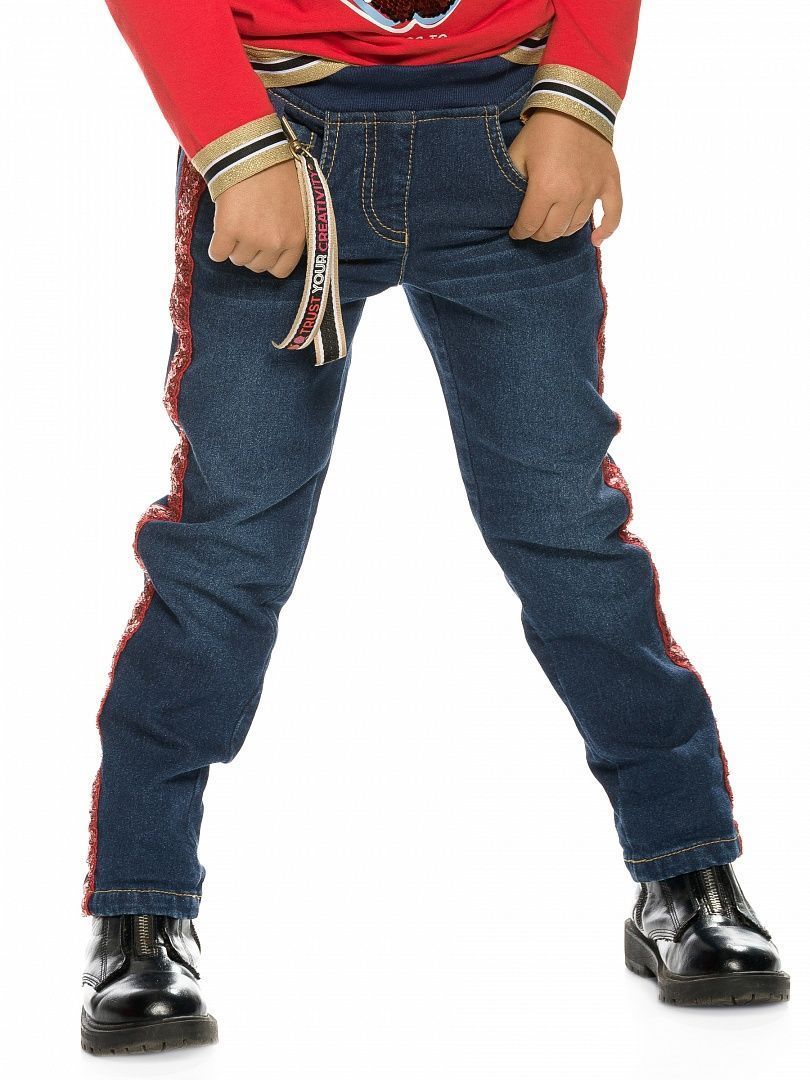 Состав: 65%хлопок 33%полиэстер 2%эластан Джинсы для девочек с начёсом прямого силуэта, по бокам брючин декоративная капроновая тесьма с пайетками, по переду изделия золотистый карабин с принтованной репсовой тесьмой, перевод надписи Доверяй своему творчеству, пояс из эластичной рибаны с внутренней регулировкой шнурком.