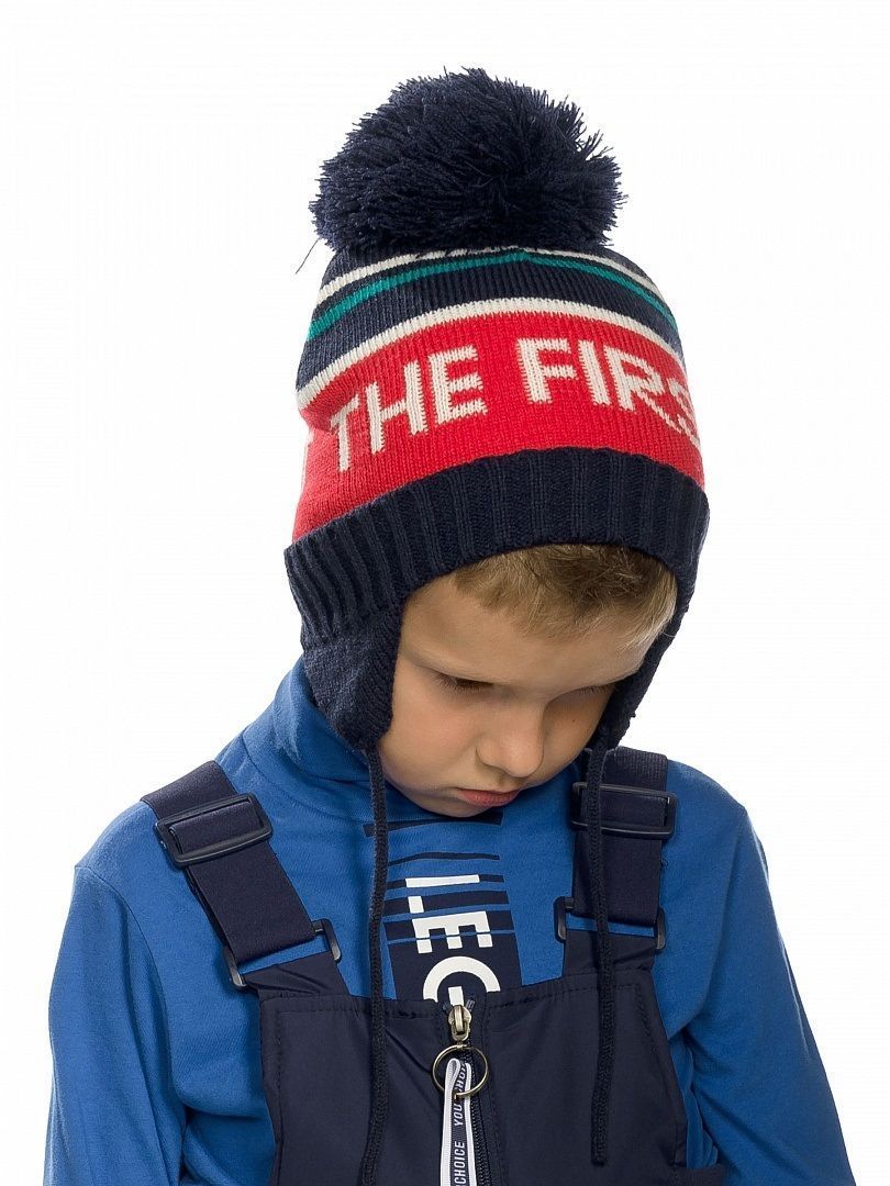 Состав: 100%акрил, подклад: 100%полиэстер Шапка для мальчиков. Вязаная шапка с подкладом из флиса. Ушки шапки цельновывязанные, помпон и завязки. Вывязанный принт "Первый".